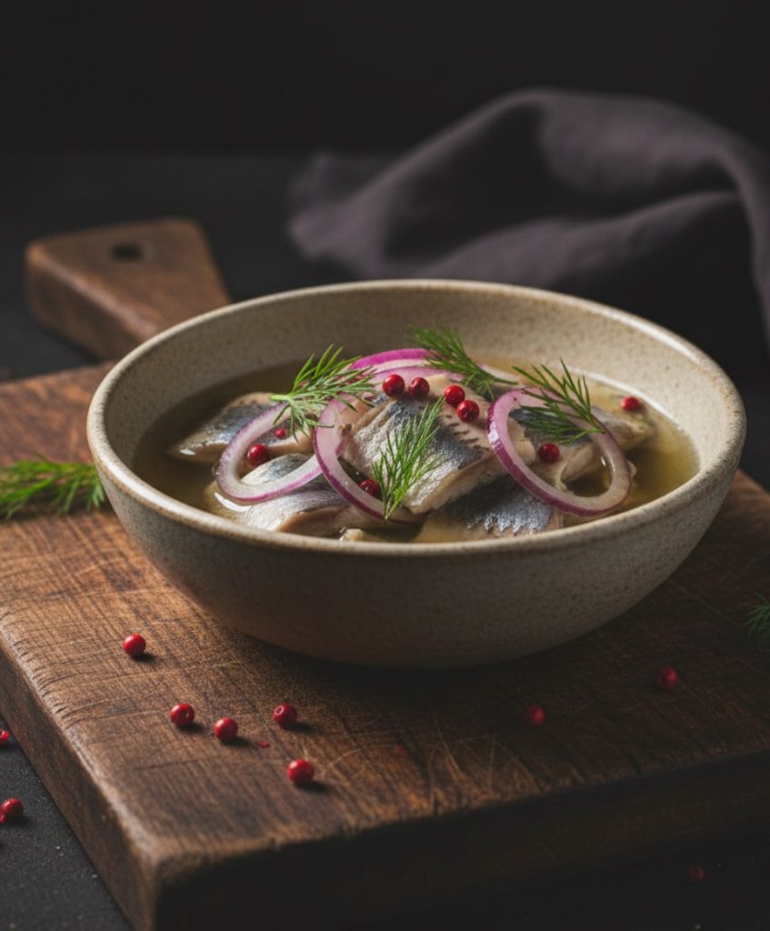 âą sill – i en rustik skĂ„l med lite dill och lite rosĂ©peppar över.
