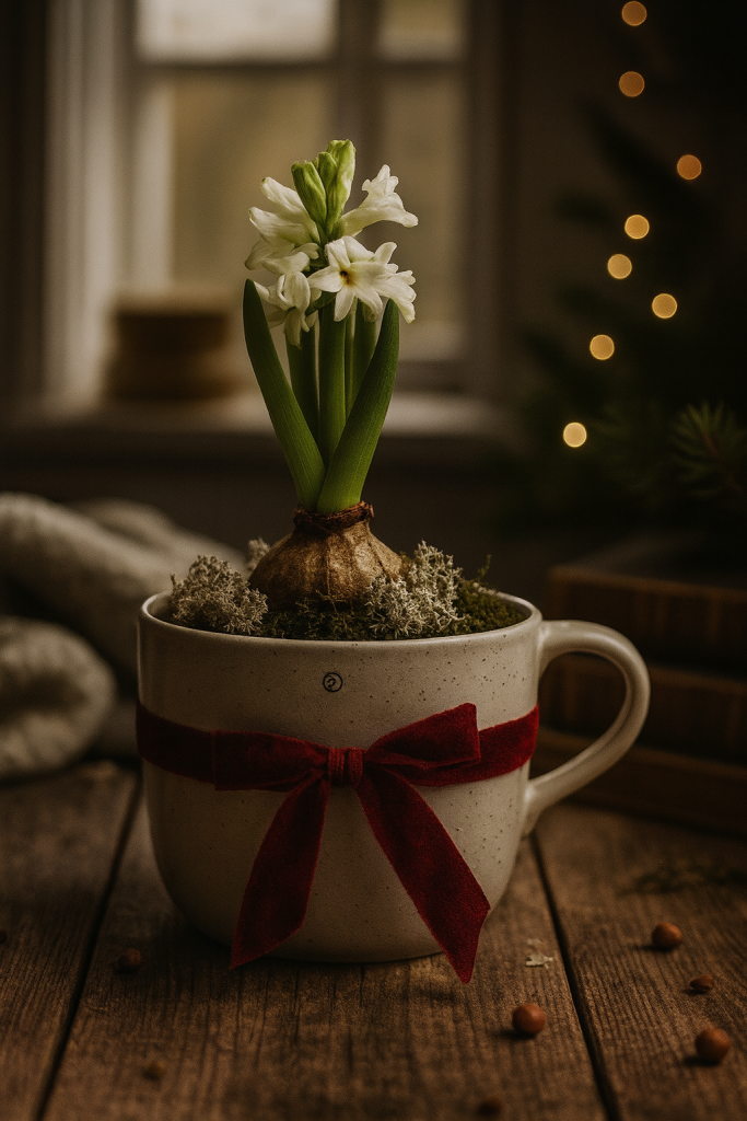 En liten hyacint eller mini-amaryllis som du planterar i en vacker mugg, en Àrvd kopp eller ett loppisfynd för en tia.