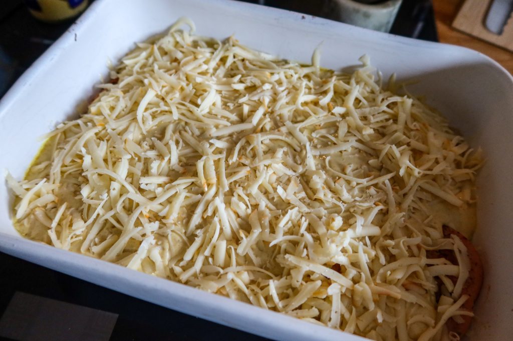 5. HÀll sÄsen över korven i formen. Toppa med riven ost.