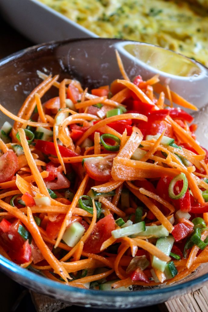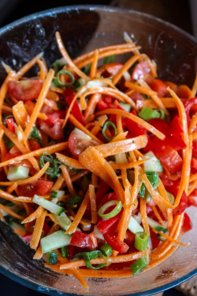 Jag serverade min med en frÀsch sallad pÄ spetsparika, cocktailtomater, gurka, riven morot och salladslök. Till det en enkel dressing pÄ: