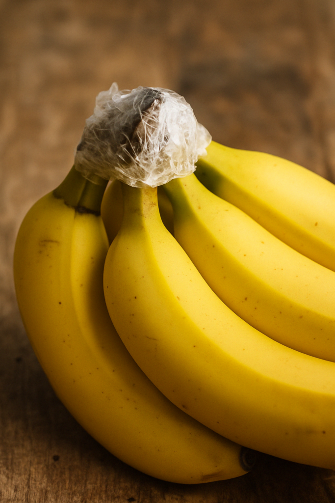 Linda in stjälkarna på bananklasen med plastfolie – det bromsar mognaden och håller bananerna fräscha längre.