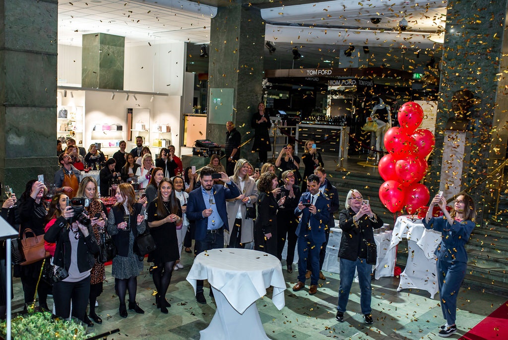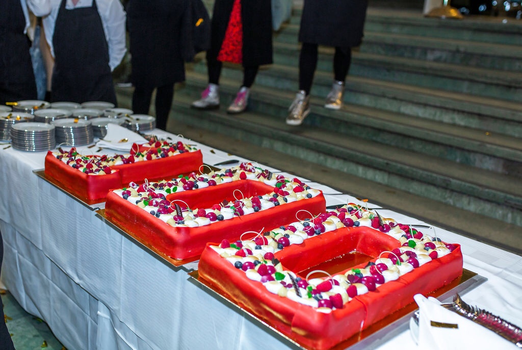 Det sköts konfetti och självklart fick vi äta 100 årstårta. Kitchenaids nordenchef Cecilia Liss välkomnade både gäster och den fantastiska tårtan.