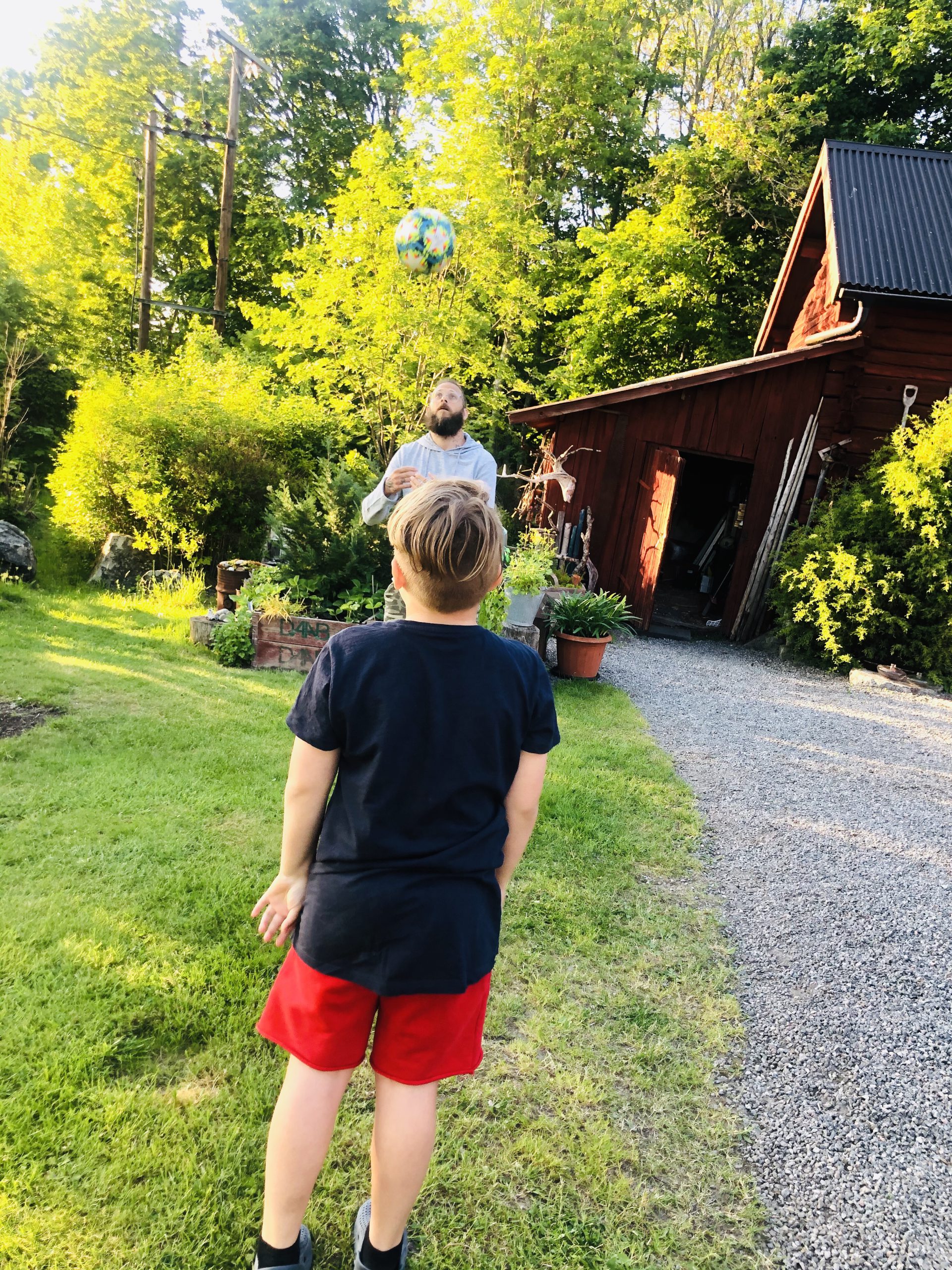 Det var fotboll i trädgården efter kompis Neo åkt hem. Milo köpte en ny fotboll idag, tror det är den 147:e faktiskt. Men vad säger man då? Han spar ihop pengar och så handlar han saker för dem, då har man inte mycket att säga till om ju. Stackarn har fått såna jäkla skavsår av fotbollsskorna så han får glida runt i tofflor nu när de är som värst. Minns ni skavsåren man fick när man var mindre? Jag minns dom som igår? Helt galna för tusan! Stora vidriga blaffor som sprack och gjorde så satans ont.