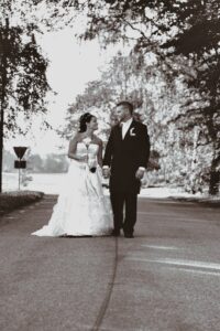 Vi gjorde så mycket vi kunde själva till vårt bröllop. Inbjudningarna, festhäften, jag sydde alla dukar till alla bord. Till ett bord gick det 40 meter duk då vi hade 3 olika dukar och vi hade 5 bord. Jag sminkade mig själv…. ja vi gjorde så mycket vi kunde själva. På det sättet lyckades vi spara in där det gick att spara in. Vi hade 100 gäster på bröllopet och kunde bjuda på en riktig jäkla superfest, det var det vi ville och det vi prioriterade. De sista gästerna gick kvart i 6 på morgonen. Haha…..