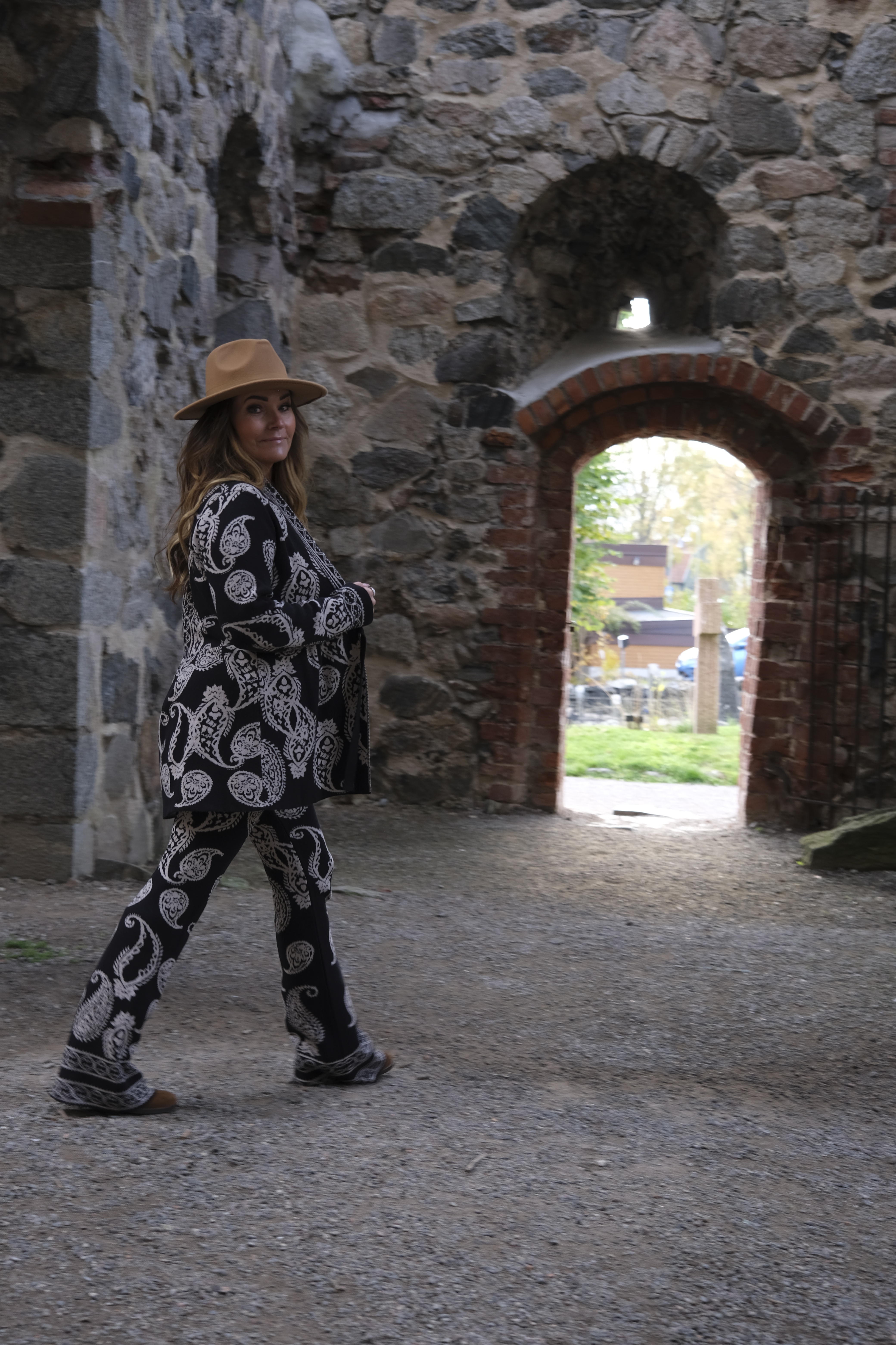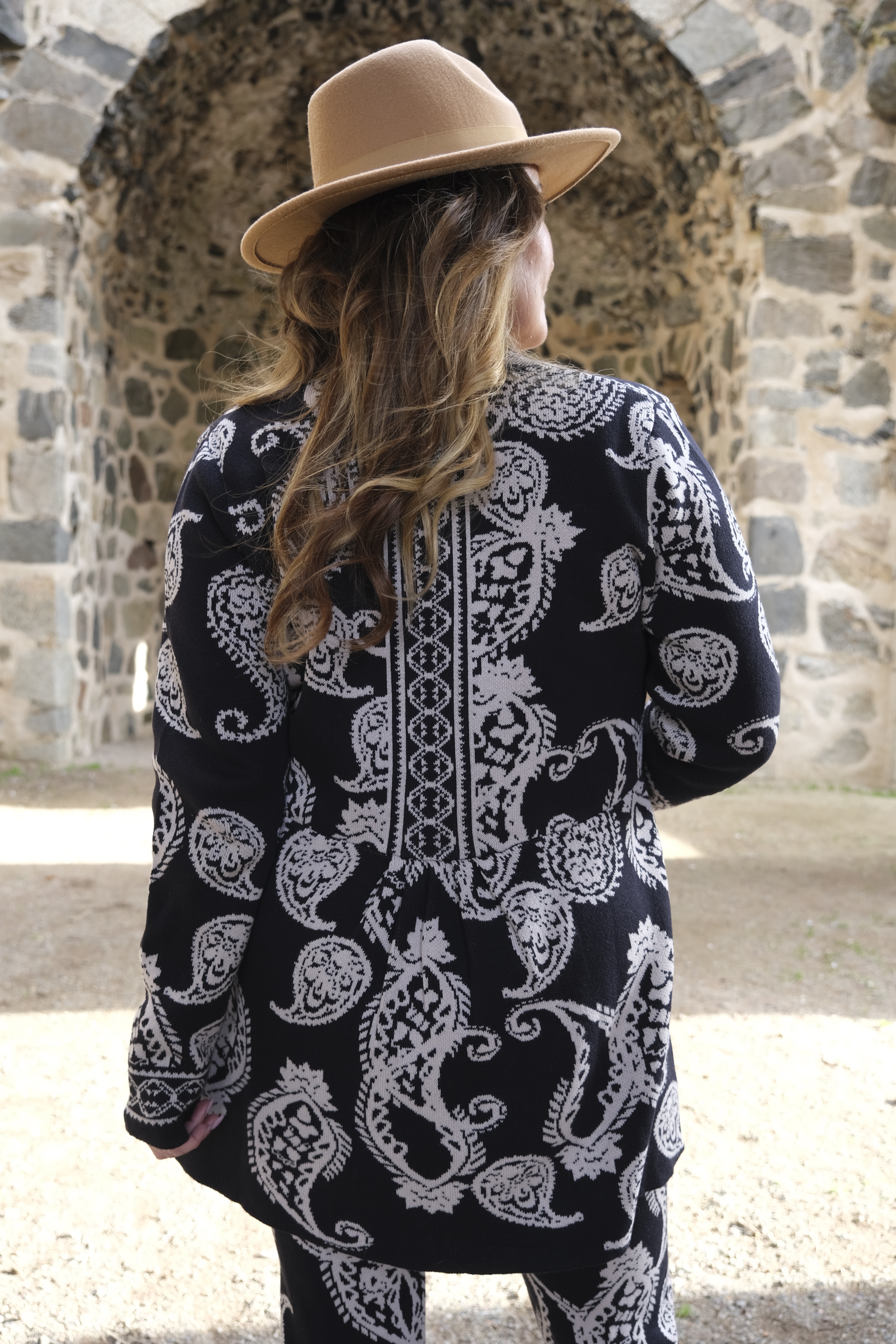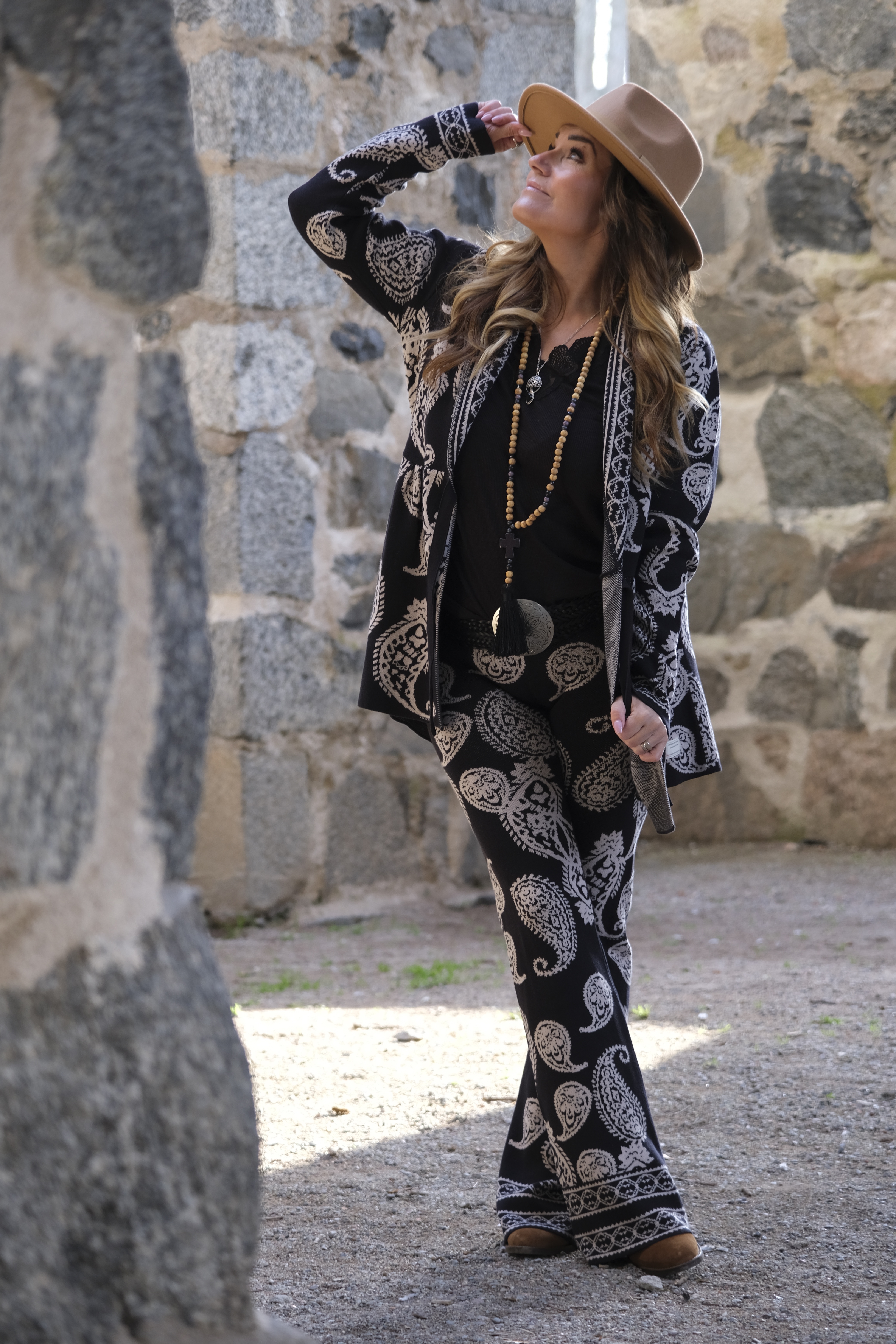 Alltså wooooow woooow wooooow! Som jag föll pladask för denna ”kostym”. Allt i skönt stickat material. Och så detaljerna och printet!!! Koftan är som en riktigt snygg kavaj, har du ett spetslinne eller en snygg blus under kan du gå på en riktigt fin middag eller fest i den. Nej men sååå snyggt. Byxorna, sköna som mysbyxor och så underbart snygga och coola! Skön resår i midjan så de klämmer absolut ingenstans. Gud vad jag kommer använda detta alltså.
