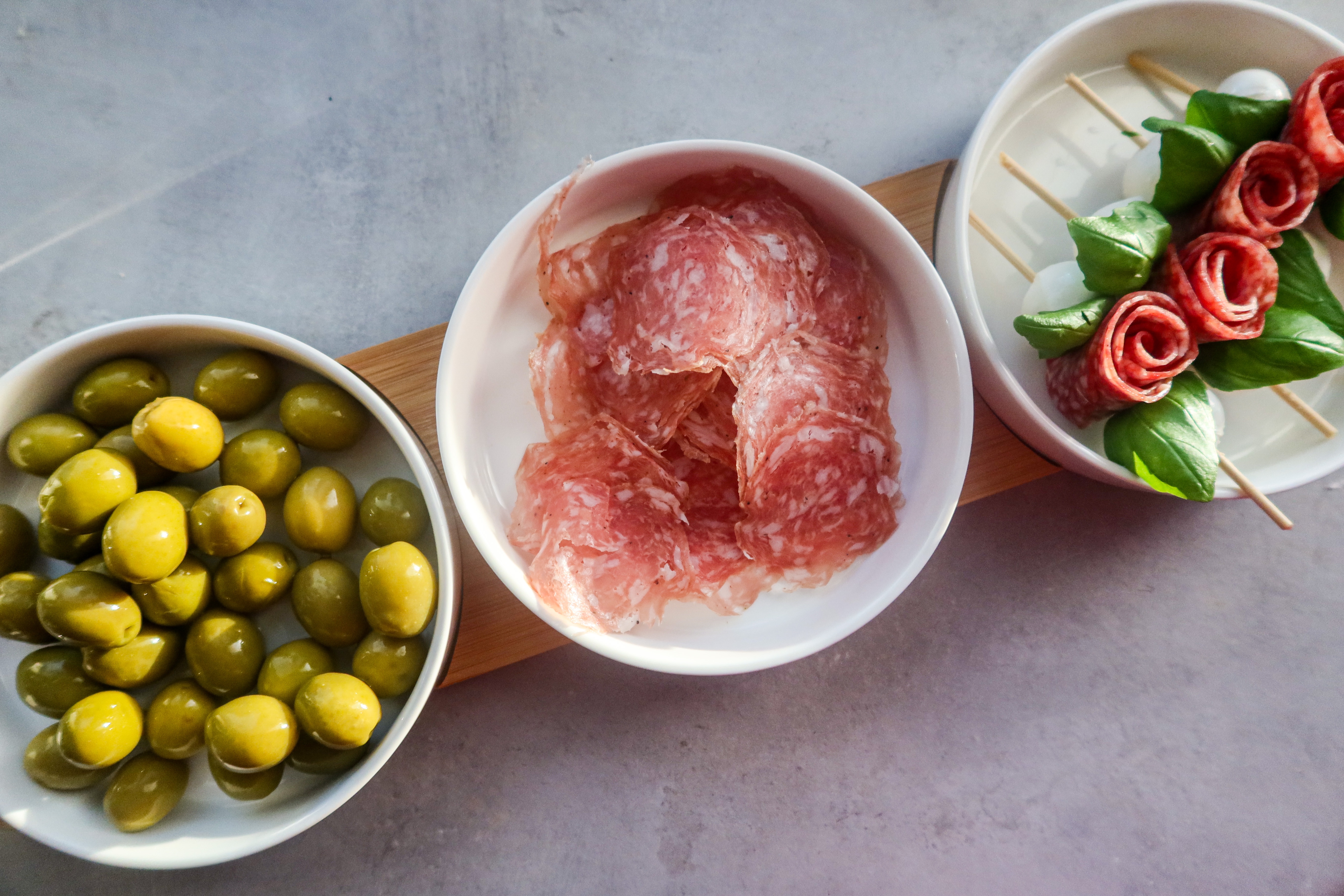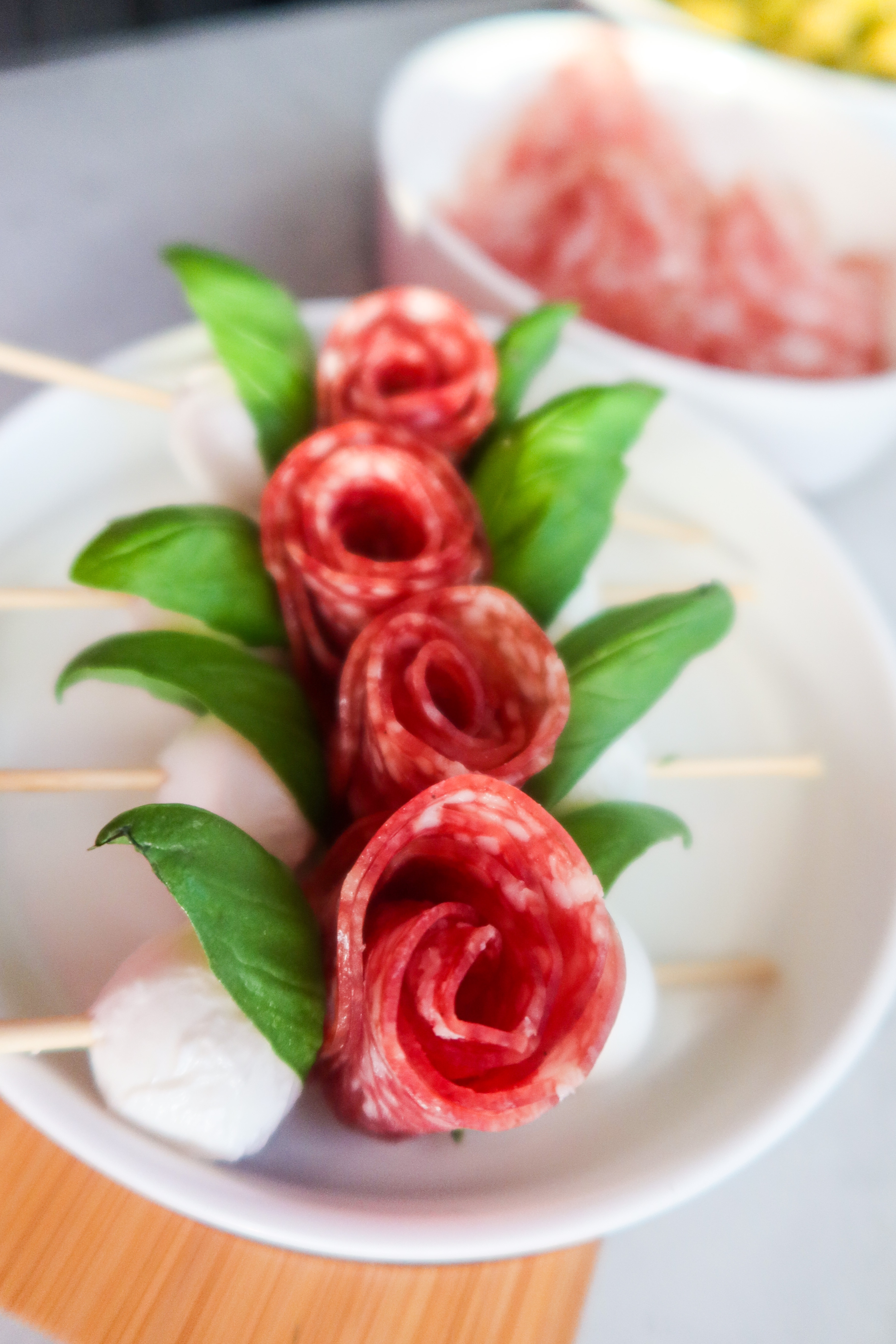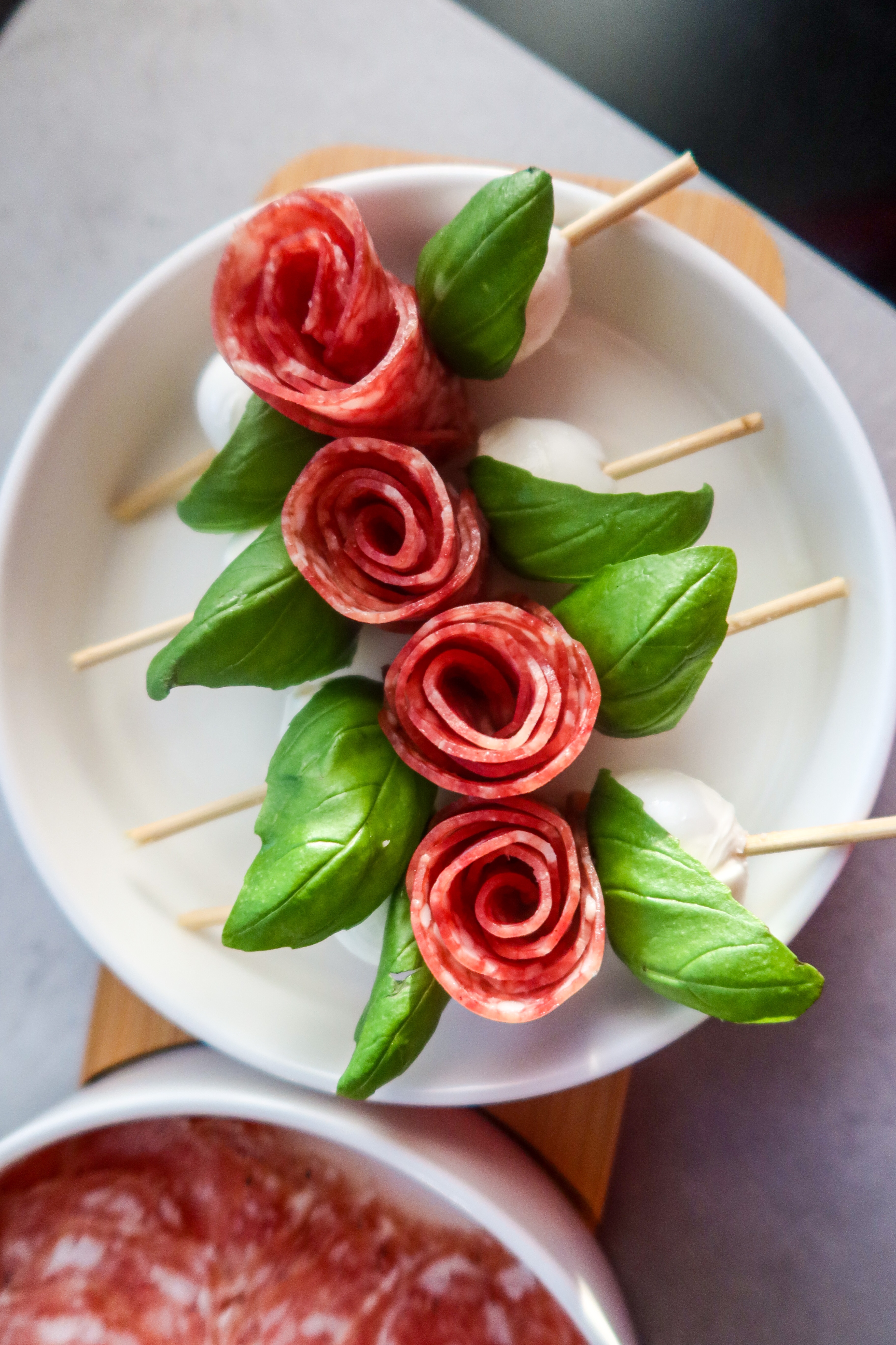 3) Ta fram bitar av grillspettspinnar, trä på mozzarella, ett basilikablad, salamirosen, basilikablad igen och avsluta med mozzarella.