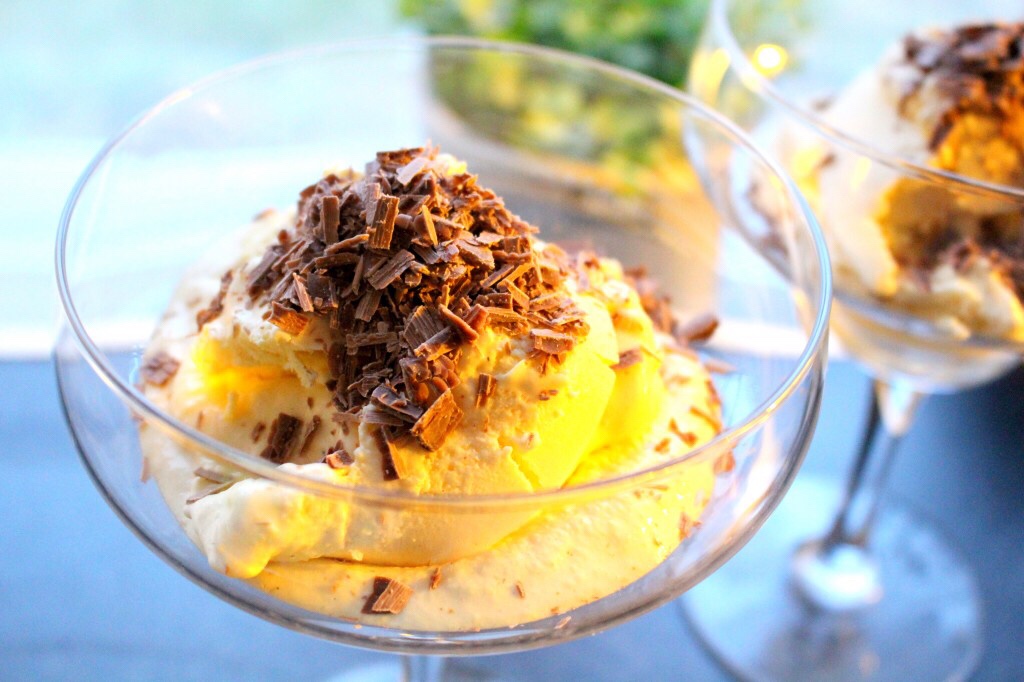 Vispa grädden lite, inte så mycket så den är helt fast men den ska bli lite fluffig och krämig. Häll sedan i vaniljsocker och florsocker i vispet. Häll allt i en blender. Häll i den frysta mangon och pressa ned den lite så den hamnar i botten. Låt sedan blendern stå och gå tills du ser att den blir sådär härligt krämig. Om du vill äter du den direkt, annars kan du hälla den i en bytta och ställa i frysen. Servera med riven choklad. MUMS!