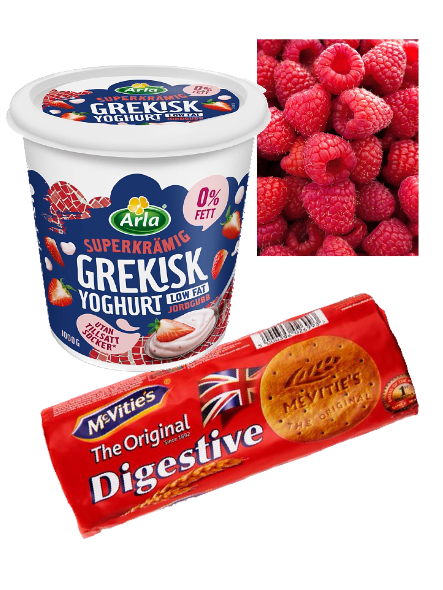 Grekisk yoghurt med jordgubbssmak, digestivekex och färska hallon. Djup tallrik med grekisk yoghurt, smula över några digestivekex och toppa med hallon. Hur gott som helst.