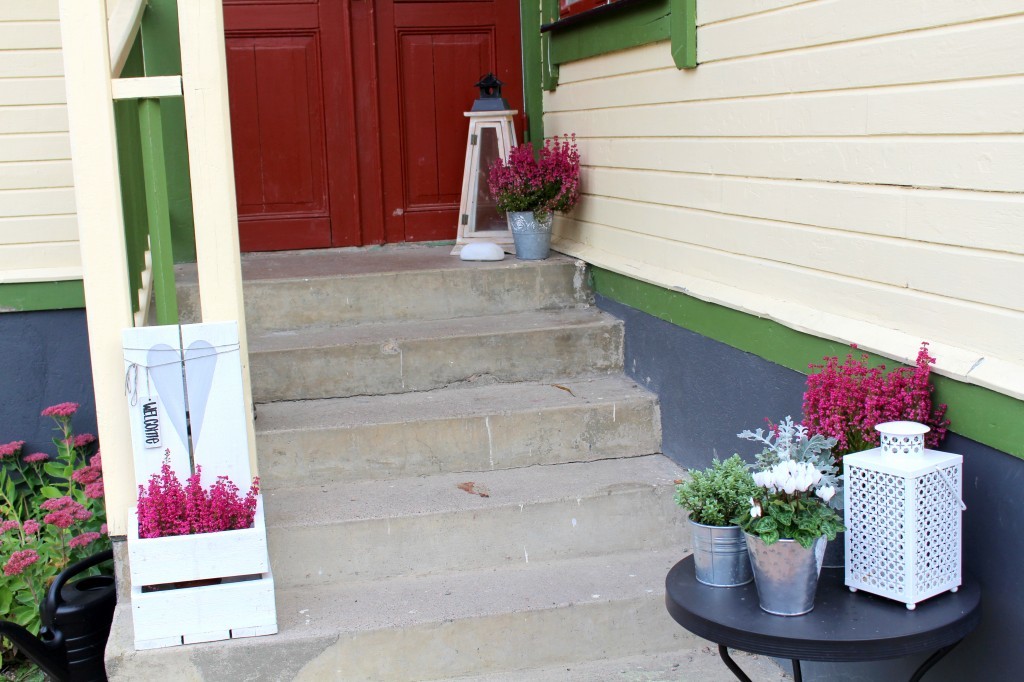 Den här trälådan har jag alltid utanför dörren. Fortfarande faktiskt. På sommaren har jag en stor pelargon i den och på hösten är det ljung och vid jul en gran såklart. Den har jag snickrat ihop själv och det är busenkelt. Det är 90 brett vanligt trävirke.