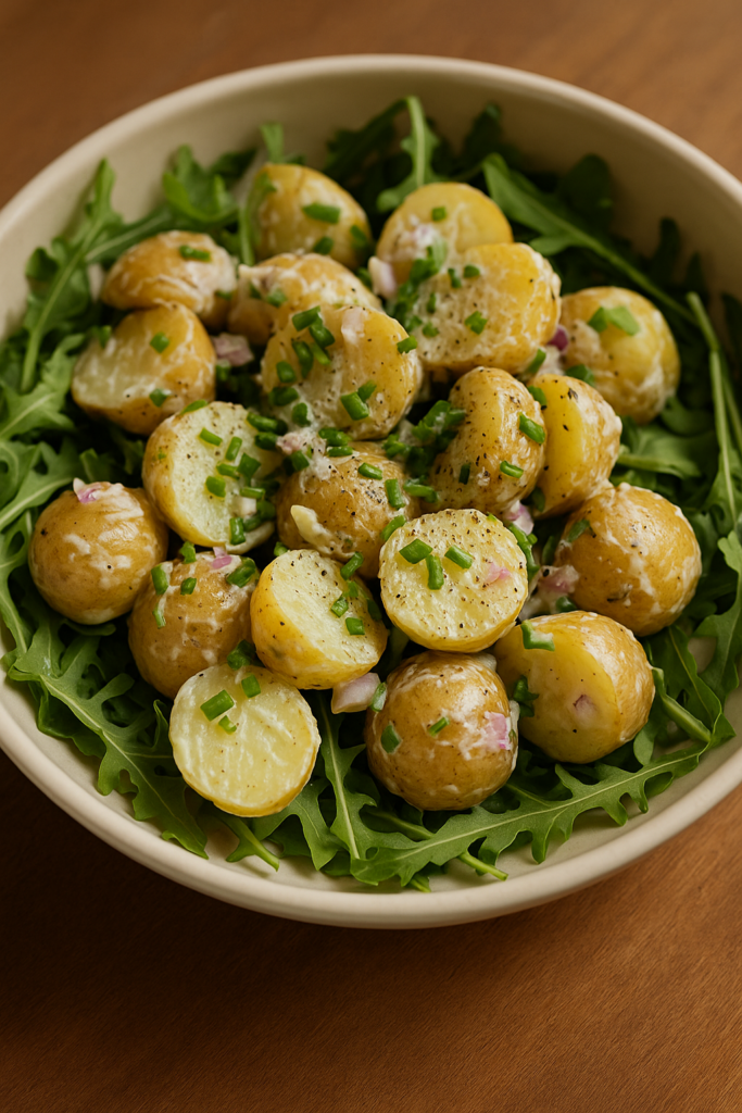 5. LÀgg ruccola pÄ ett fat. I med potatisröran. Klipp grÀslök över eller finhackad rödlök.