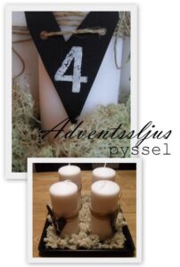 Jag ställde 4 ljus på fatet och sen fyllde jag på med massor av mossa. Den ska vara fuktig när du håller på, då får du in den mellan alla ljusen. Sedan tryckte jag dessa siffror på det svarta pappret, 1 2 3 4. Därefter gjorde jag hål med hålslagare och trädde i ett extra långt hampasnöre. Snurrade det några varv runt ljuset och fäste med en stor rosett.
