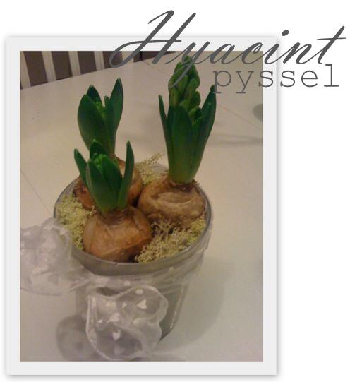 Jag har valt en vit genomskinlig kruka eftersom jag tycker det känns lite juligt. I med jord och de 3 hyacintlökarna. På med mossa. Här kan man sedan låta fantasin flöda. Jag har ett pärlband som jag tänkte smycka med så småningom. Det finns oxå kvistar av olika slag, jag såg silvriga som man kan sticka i mellan lökarna oxå. Nåt väldigt fint är att fylla på med murgröna. Det tänkte jag göra i en anna större kruka sedan. Avsluta med något fint band runt krukan. Mitt band är från IKEA, vitt med hjärtan på.