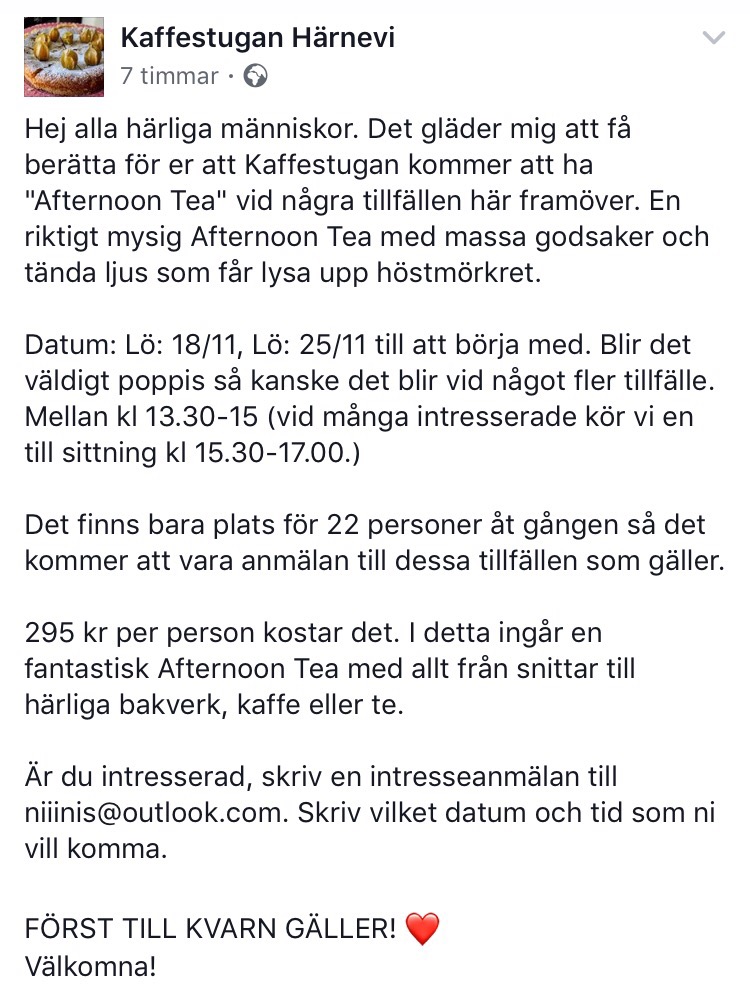 Är du sugen på att ljusa upp höstmörkret med en mysig ”Afternoon Tea” i lilla Kaffestugan så kutar du in och anmäler dig på niiinis@outlook.com. Skriv antal personer och datum.