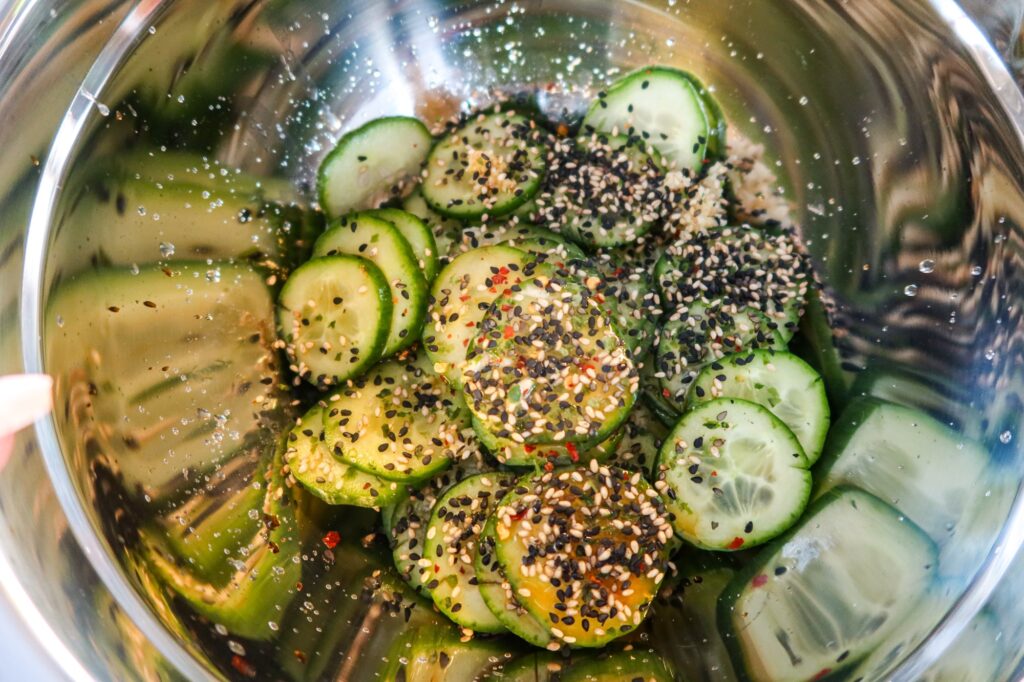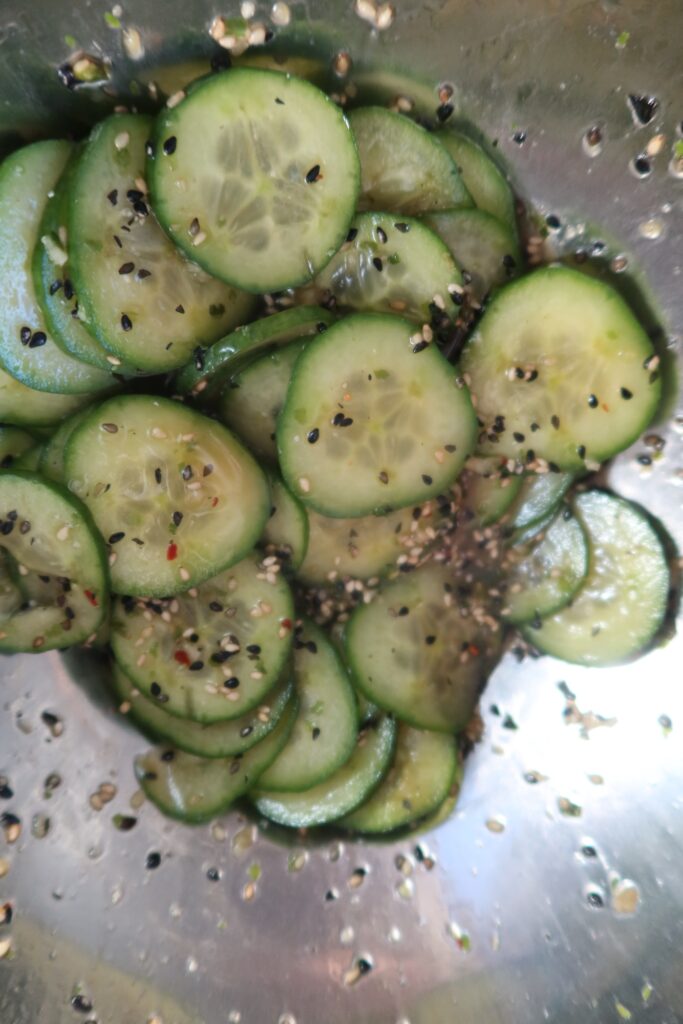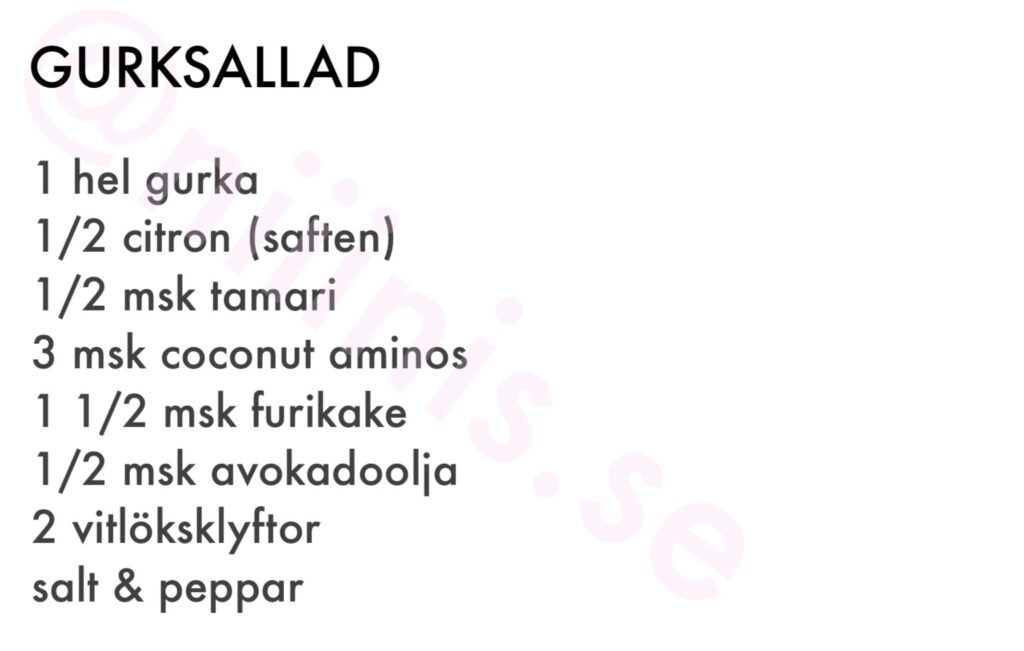 Har du inte ovan produkter (rekommenderas starkt dock) hemma och ändå vill göra denna gurksallad, så byt ut Coconut amino & Tamari mot Japansk soja, och avokadoolja mot olivolja.