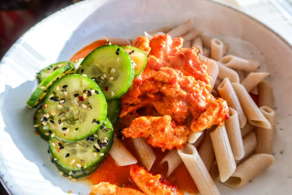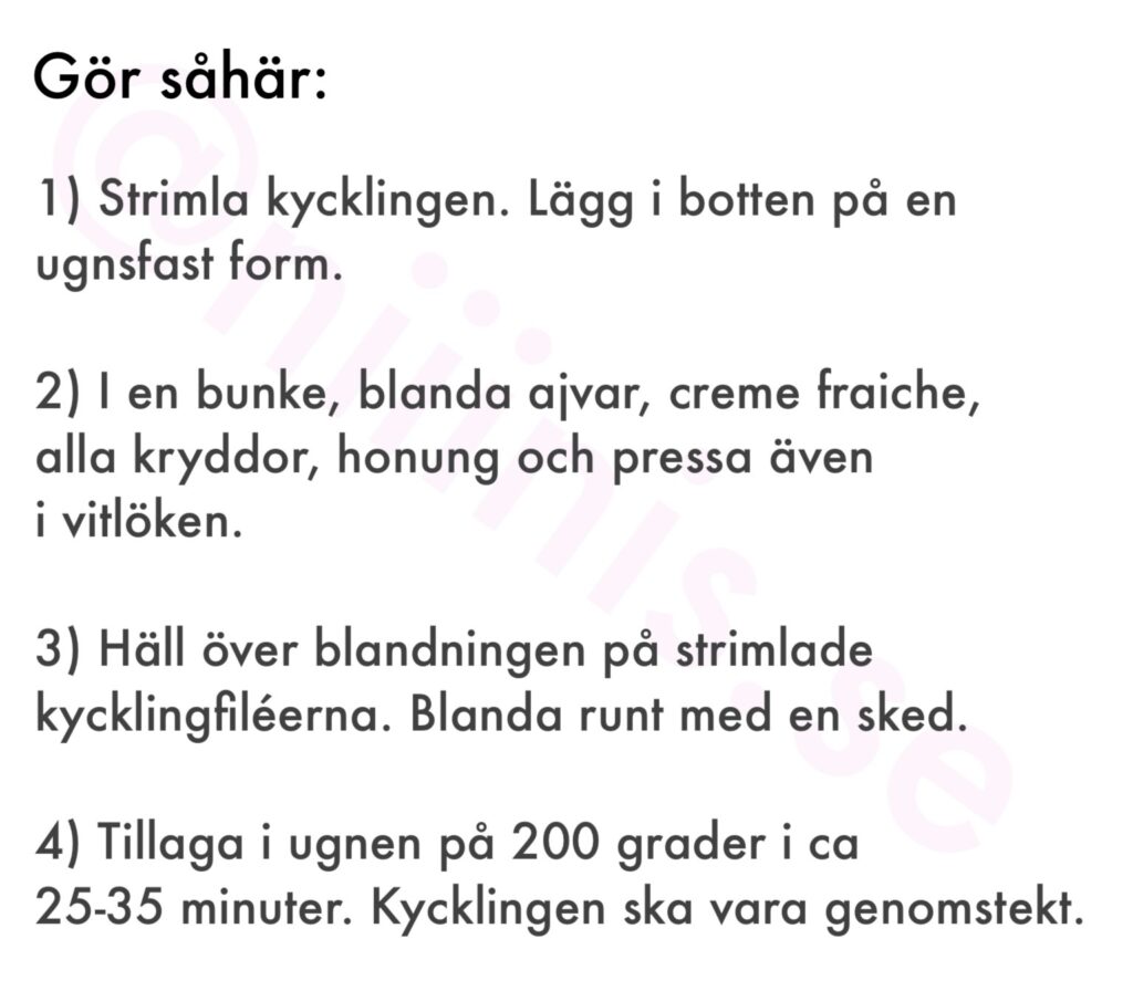 Igår lagade jag en riktigt god rätt med ajvarkyckling, den här är nästan löjligt enkel att laga och sköter sig själv i ugnen. Ajvarkyckling kan man bestämma ”styrka” på själv. Det finns ju starkare ajvar, jag använde den som är mild. Till vår Ajvarkyckling gjorde jag en gurksallad som blev så himla god. Så fräsch och jag kan säga att det blev inte en enda gurkbit kvar.