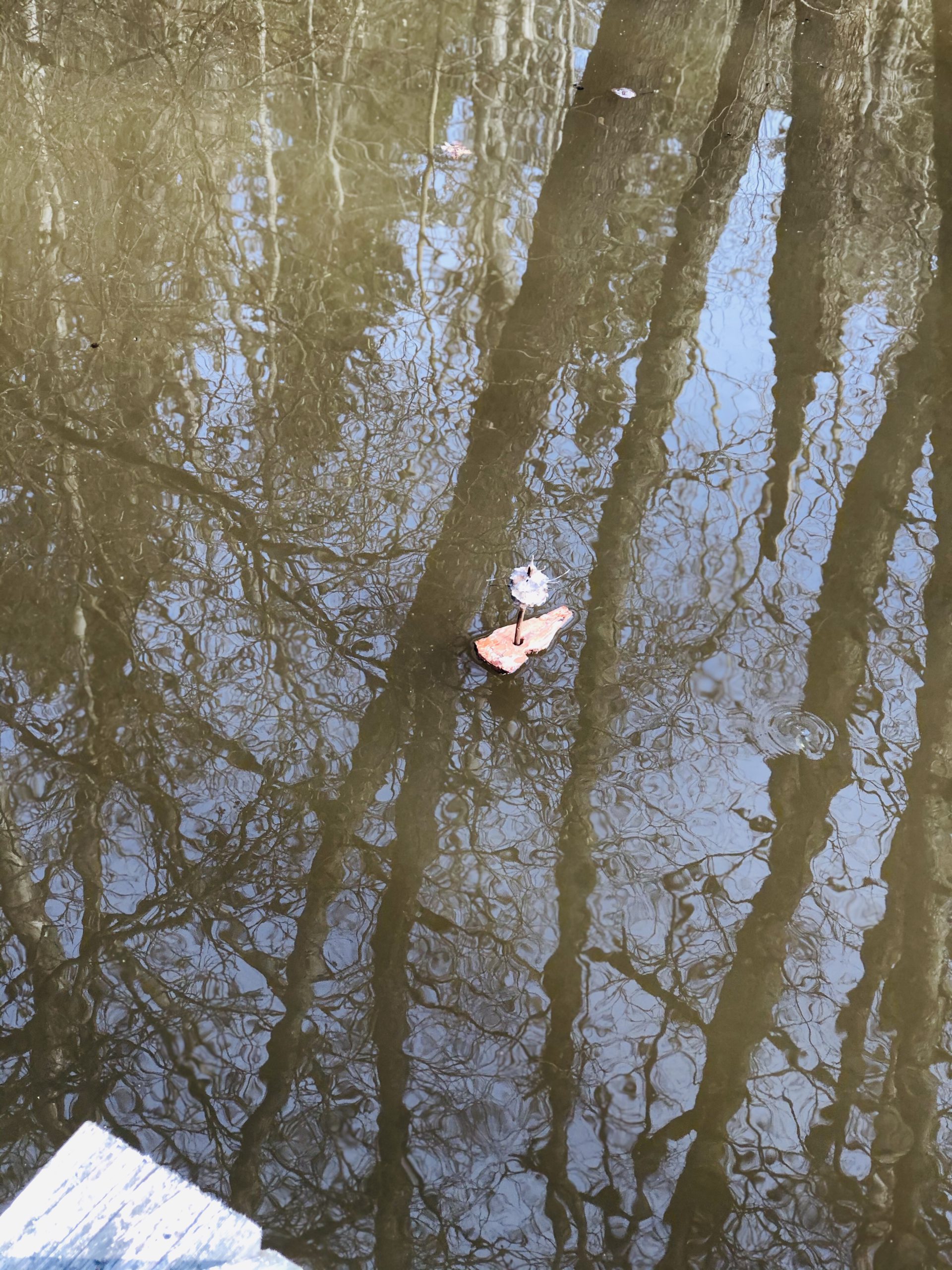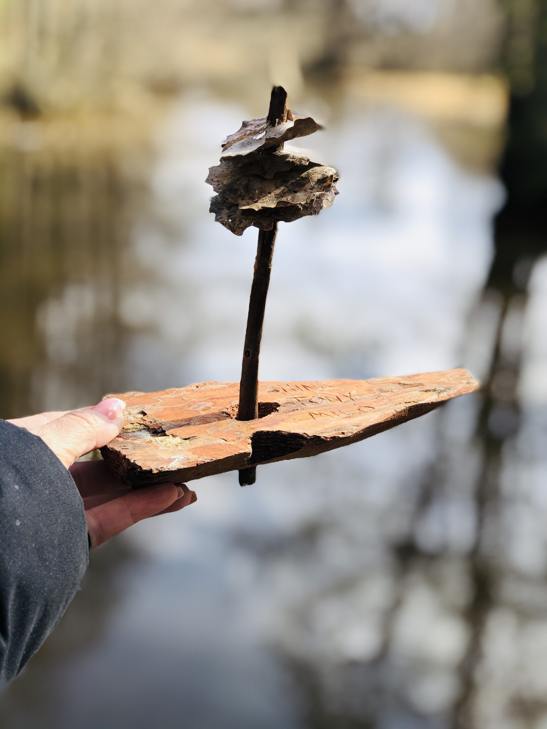 Vilken barkbåt han täljde sen då? Är det här prick den finaste barkbåten jag sett eller? Tony ristade in våra namn i den och allt. Så fint. 😢 Min känsliga pms-själ klarar knappt sånt just nu. Vi skickade iväg den utefter vattnet och den höll sig flytande och upprätt. Hade jag inte behärskar mig hade jag bölat på bron.
