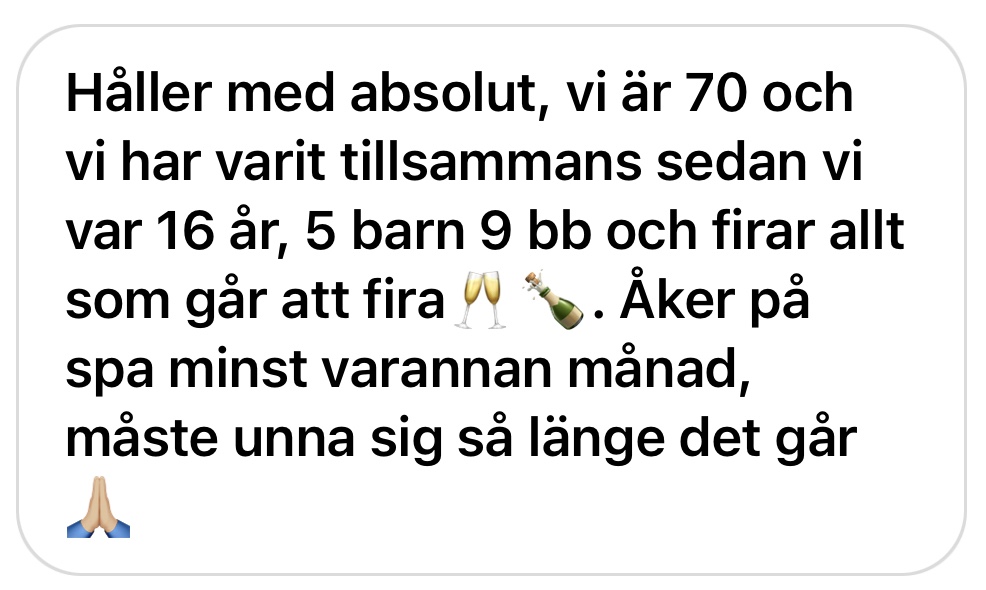 Det här gjorde mig så himla glad i hjärtat! ❤️❤️❤️De har levt ihop i 54 år. Firar allt de kan fira, åker på spa minst varannan månad. Är detta framgångssagan med att leva lyckliga i alla år i sin relation? Kanske? Det lutar i alla fall emot det!