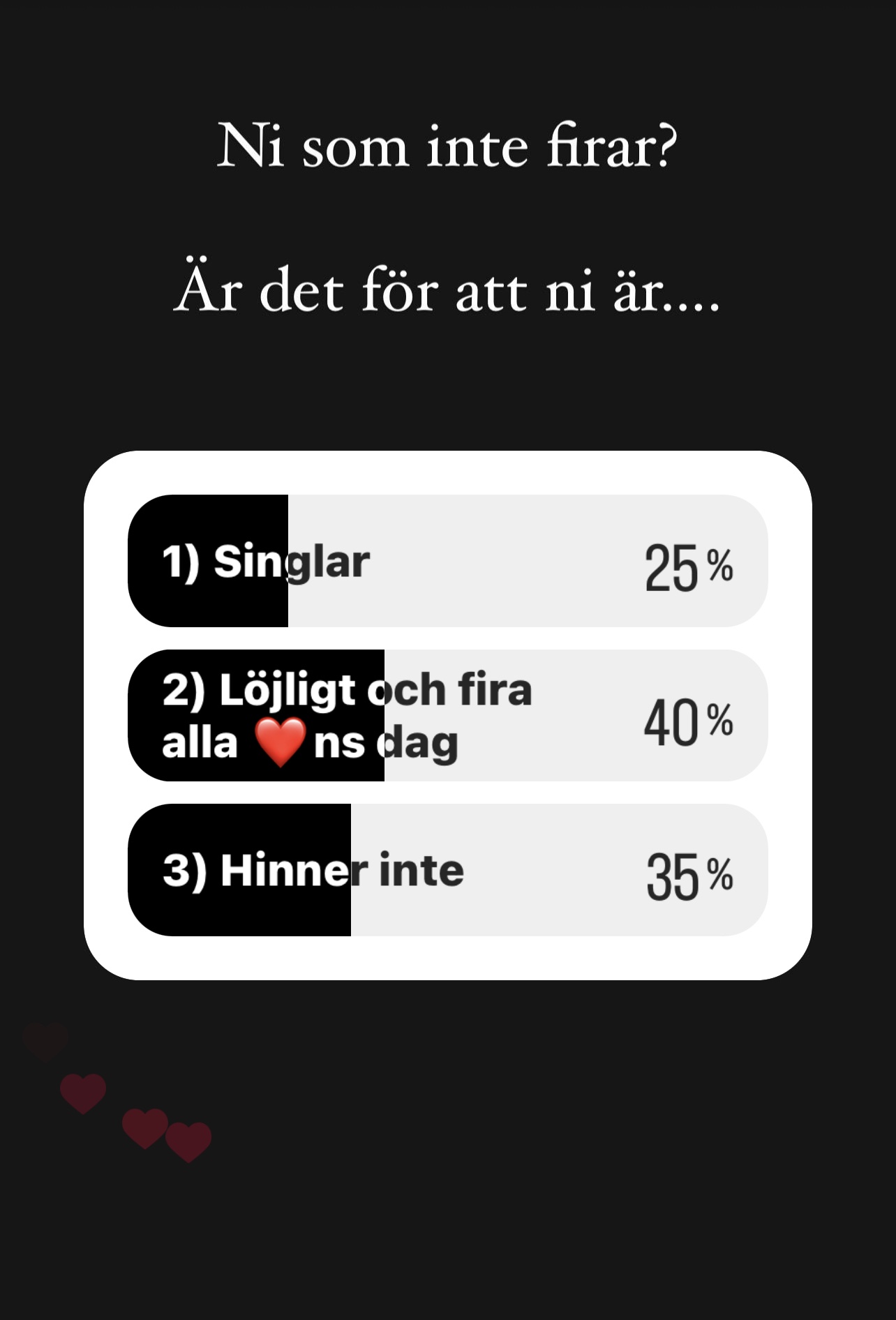 Apropå Alla Hjärtans Dag, det visade sig vara en het potatis märkte jag på min Instagram story igår. Det verkar vara provocerande för en del med Alla Hjärtans Dag. En del tycker att det är trams, hysteri, ett kommersiellt trams som är uppsjåsat till en enda dag när kärleken skulle firas varje dag. En del lider av den dagen då de kanske är singlar, kanske ofrivilliga singlar vad vet jag? En del är ledsna för att de lever med en totalt oromantisk partner som t ex vägrar betala pengar för en middag på stan en sån kväll eller ens har köpt en blomkvast på alla år de varit tillsammans. Detta är alltså dm:s som jag fått från folk på min Instagram som berättat detta.