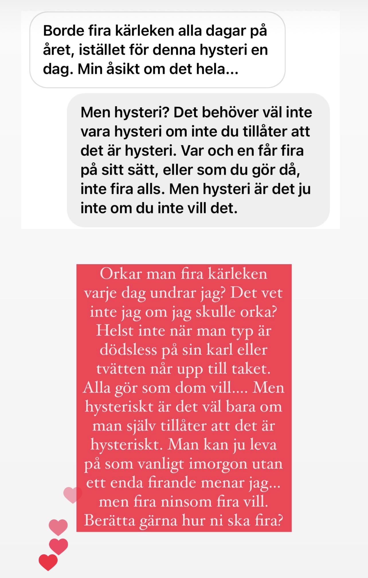 Sen skulle jag personligen aldrig orka fira kärleken varje dag. Pms, förklimakteriet, tvätt upp till taket, räkningar, ångest och oro, ungar som gör en galen, en sur gubbe osv kommer i vägen i livet ibland. Jag vill ju liksom sitta i en hydda i skogen stundtals, inte jättesugen på att fira kärleken kanske just den dagen. Men jag fattar! Man kanske bara inte gillar den typen av firande, så kan det absolut vara. Ibland blir jag ändå nyfiken på varför det blir så? Är anledningen att det är en oromantisk partner iblandat, som tryckt i en att det är trams men att man kanske själv egentligen skulle älska att bli både uppvaktad och fira extra just den dagen? Eller är man bara inte den typen? Man gillar inte romantik, eller man är inte lagd åt firandets håll. För att kalla det för kommersiellt jippo, nja… det behöver ju inte vara det för just dig, du kan ju bara strunta i det kommersiella, inte köpa en enda pinal utan bara mysa hemma med en god middag och kolla en film. Kanske ge partnern en extra puss bara för att det är ”Alla hjärtans dag”, man mår ju inte sämre av det tänker jag.
