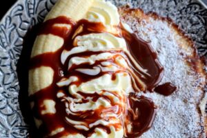 Vispa ca 3 dl grädde, skär 2 bananer på längden mitt i. Lägg på 2 amerikanska pannkakor på ett fat. Dofta på lite florsocker. Lägg en hav bananlängd på, spritsa på grädde och ringla på chokladsåsen. Ät & NJUT! ♥
