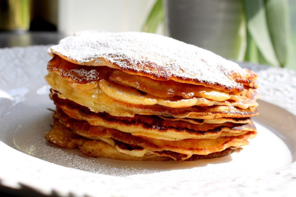 Smält smöret. Blanda de torra ingredienserna ordentligt i en bunke. Blanda sedan i en annan bunke mjölk, ägg och smält smör. Blanda sedan i mjölblandningen i äggblandningen. Rör om (vispa) runt ordentligt. Stek sedan ca 10 små amerikanska pannkakor av smeten.