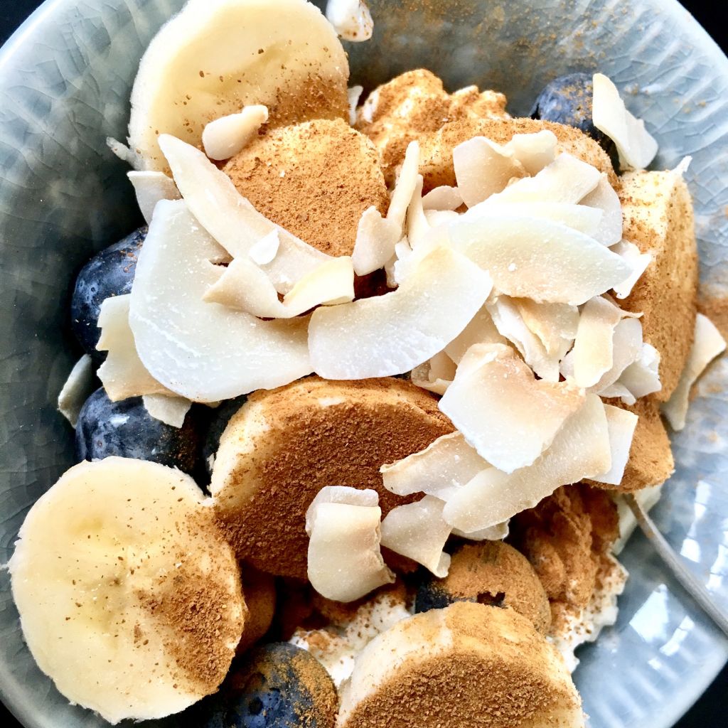 Nu ska jag dra av ett litet ”efter träning” mellis till en kopp kaffe med havremjölk. Laktosfri keso, blåbär, banan, kokosflakes och kanel. Yes, på Mallis drack jag en kopp med koffeinfritt kaffe och blev fast direkt. Har inte druckit kaffe på flera månader. Men eftersom min mage inte gillar den typen av dryck så får det bli bara ibland tänker jag.