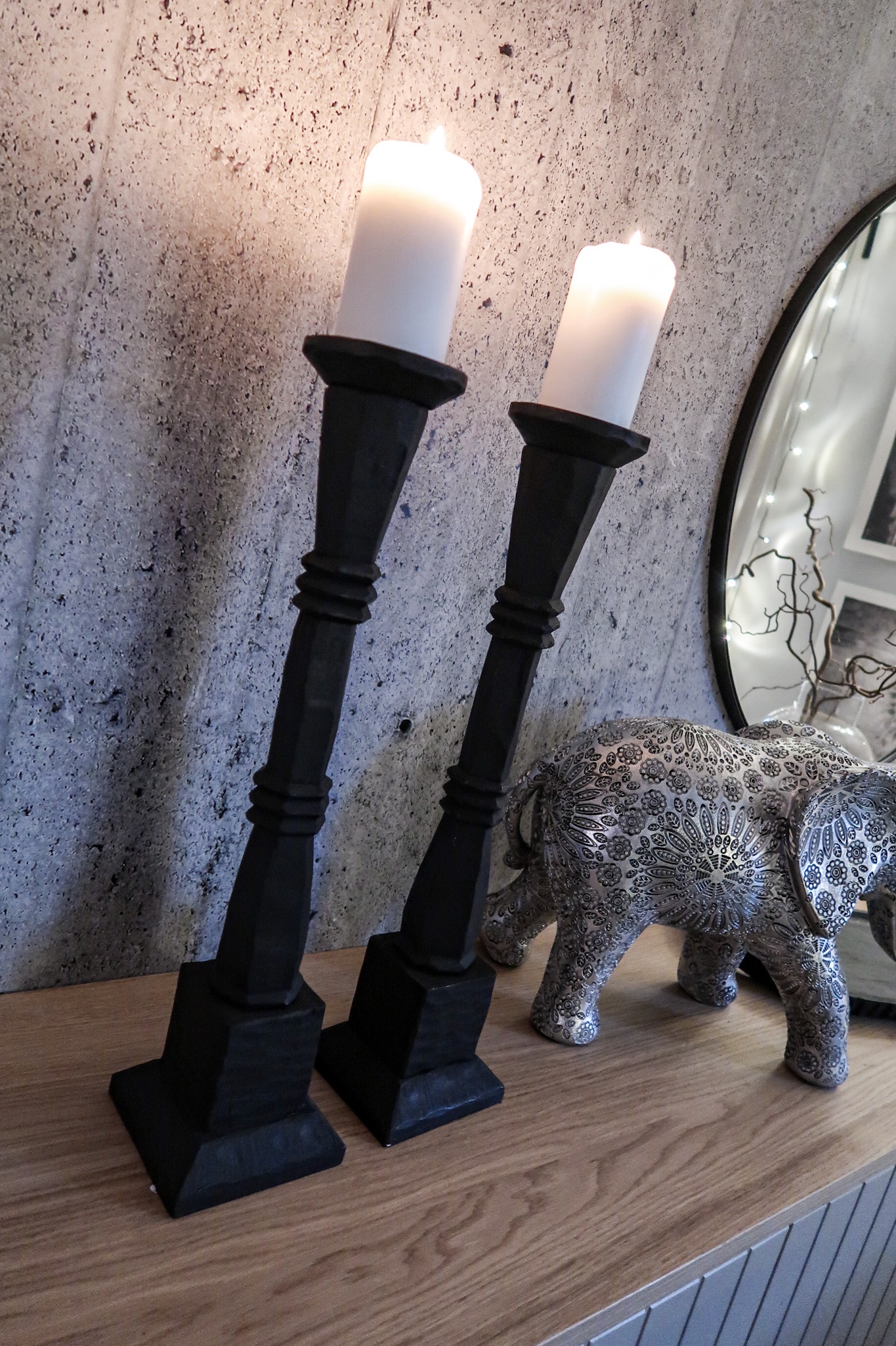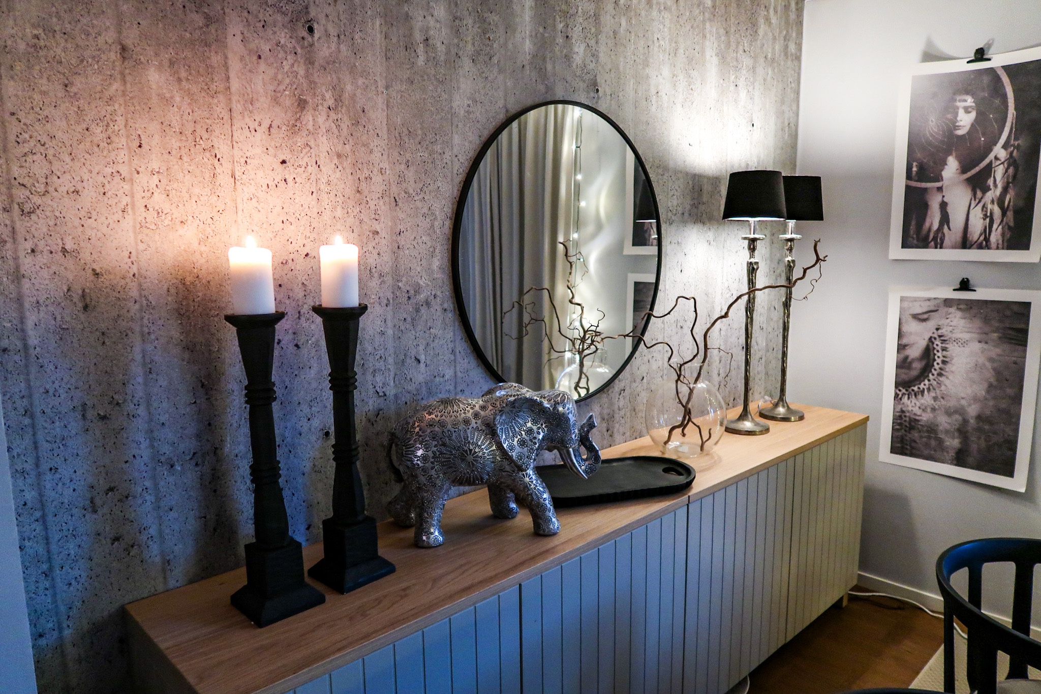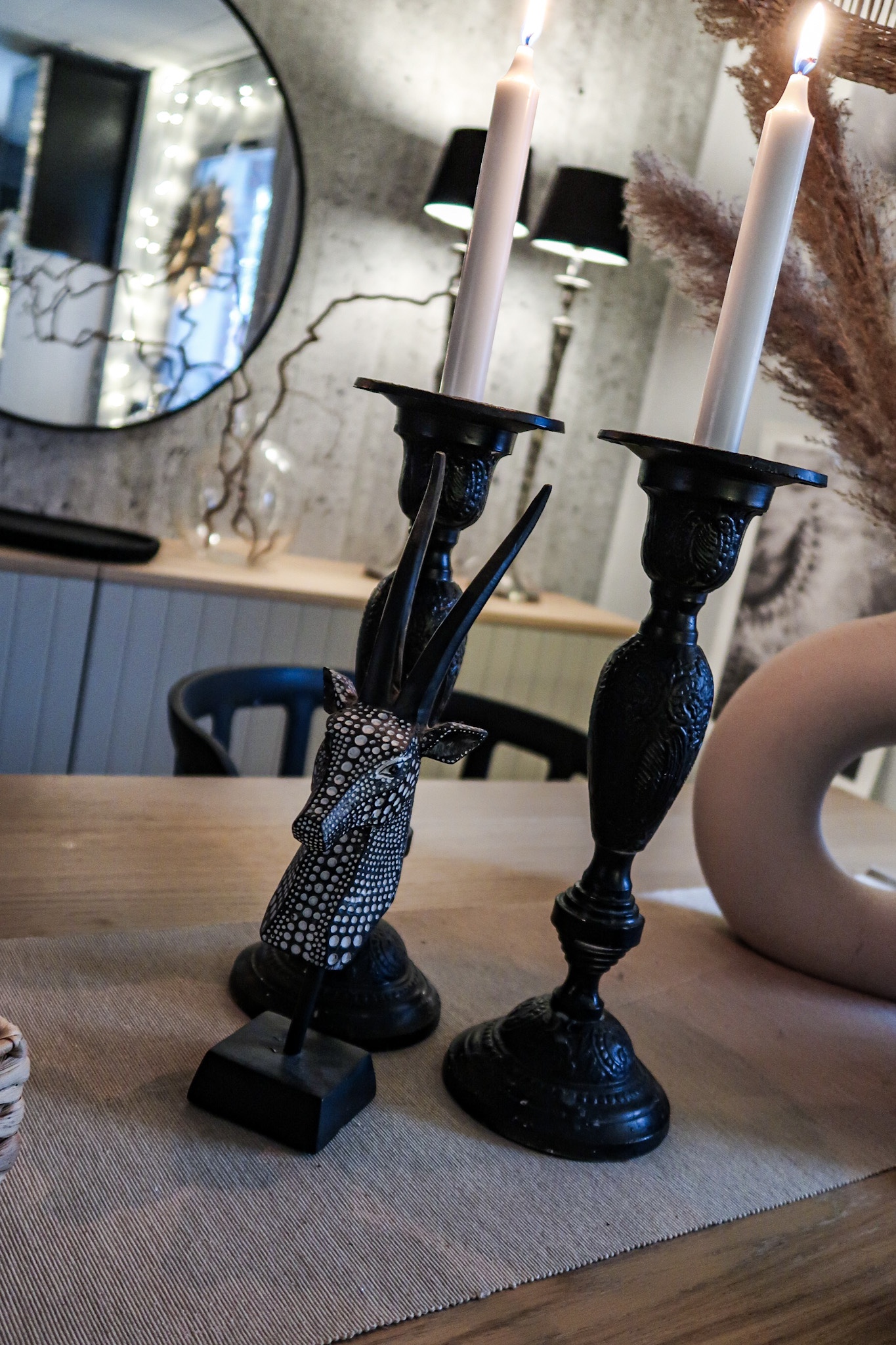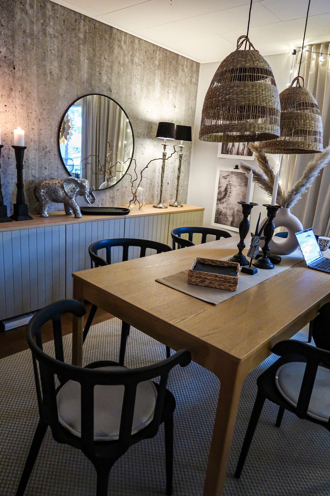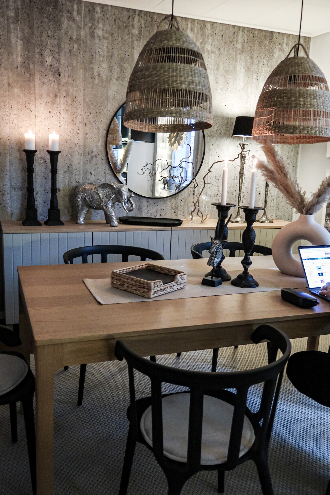 Stort svart träfat // Elefant (jag har den stora) // Stora svarta ljusstakar // Lampor matbord // Spegel Rusta // Matbord // 2 st Sideboard (luckor + toppskivor) // Matstolar // Höga lampor på sideboard // Vas på bordet // svarta ljusstakar ommålade gamla // Affisch 1 // Affisch 2