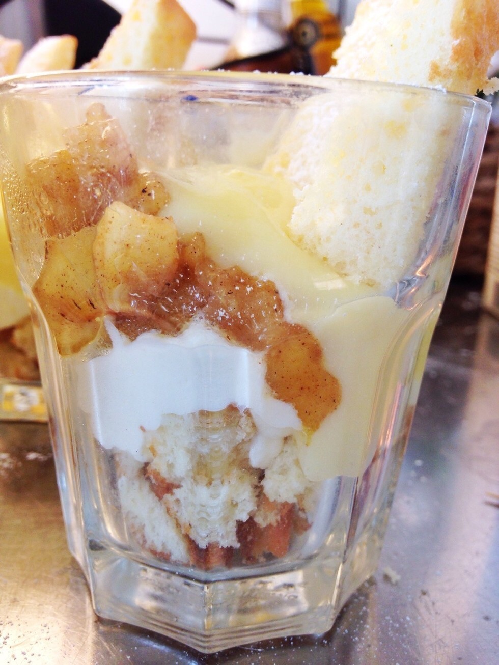 10) Varva med att klicka i vispad grädde och marsansås, äppelblandning och ytterligare små bitar av rulltårtsbotten osv tills glaset är fyllt. Toppa med lite större stänger av rulltårtsbotten och pudra på florsocker.