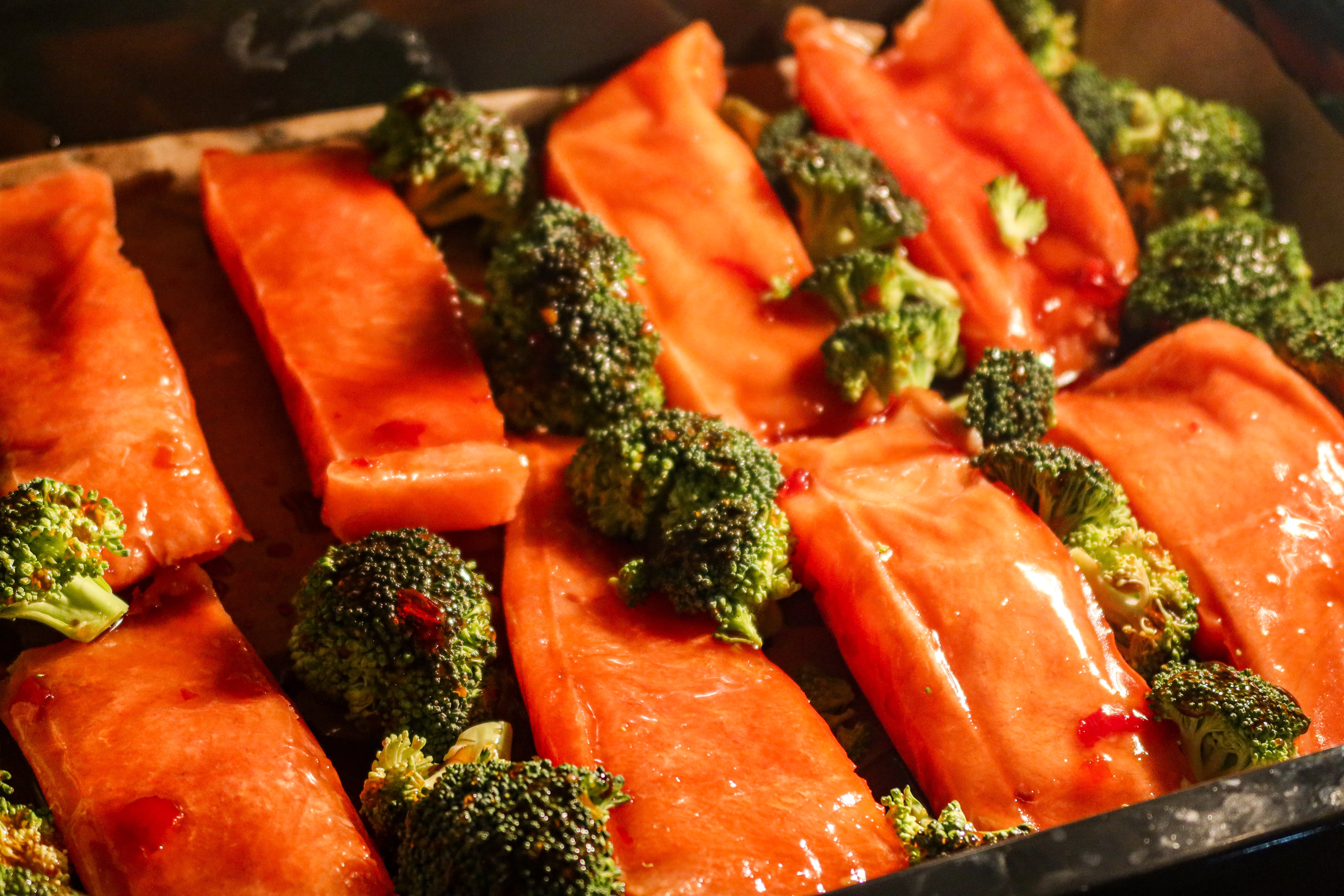 2) Blanda hoisinsås, soja, honung och sweet chili. Pensla på alltihopa på laxfiléerna. Skär loss broccolibuketterna och fördela ut dem mellan laxfiléerna. Pensla även broccolibuketterna.