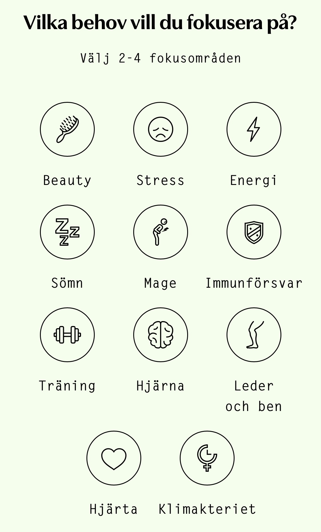 Här finns också världens bästa behovstest, det tar bara någon minut att göra. Du väljer också 1 eller flera fokusområden som du vill veta mer om. Jag valde 3 olika. Sedan får du ett utförligt svar på vad som skulle rekommenderas för dig. Det betyder att du inte behöver gissa dig fram utan kan få rekommenderat vad som skulle kunna hjälpa dig. HÄR hittar du testet.