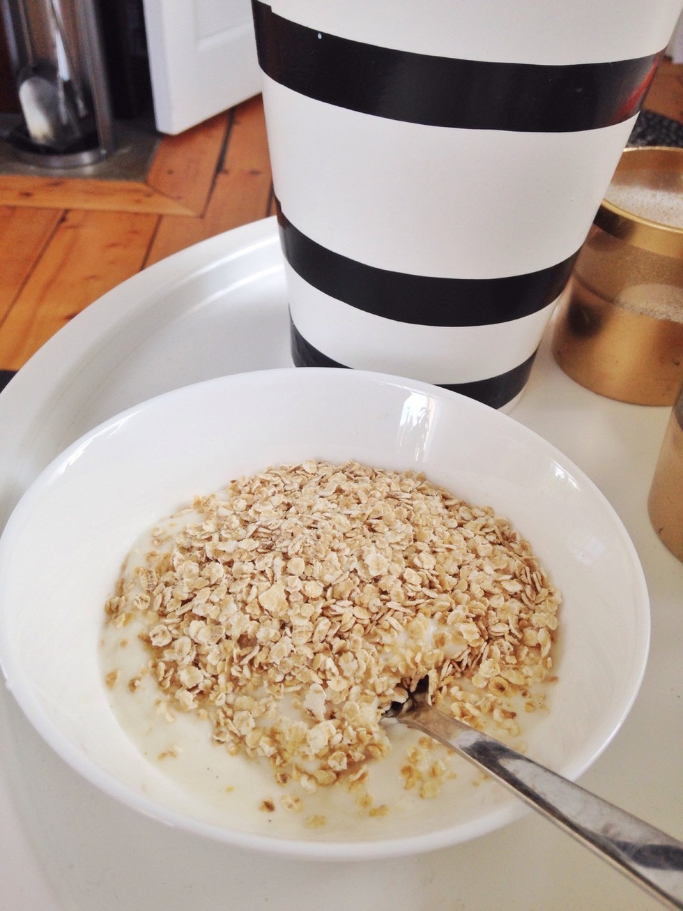 Detta blir kvällsmaten ikväll. Laktosfri yoghurt och glutenfria ekologiska havregryn. Orkar inte laga mat ikväll, vi åt dessutom en sen lunch så det blir perfekt med lite lättare att äta nu. Gör ni så ibland eller är ni Hitler med lagad mat 2 ggr per dag?