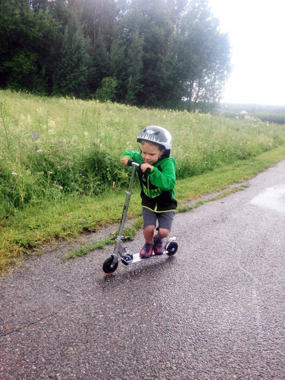 Vi klarade oss ifrån regnet, lite droppade det på oss men när det ändå är varmt i luften tycker jag inte att det gör så mycket. Han visade mig 147 olika trix med sin kick-bike. Dom ser ungefär likadana ut allihop men kommer det inte ett ”WOW” eller liknande från mig gör han 147 till. 😉 Han har faktiskt blivit jätteduktig och kan hoppa med sin kickbike och allt. Mycket ska vara coolt och häftigt i den här åldern förstår ni.