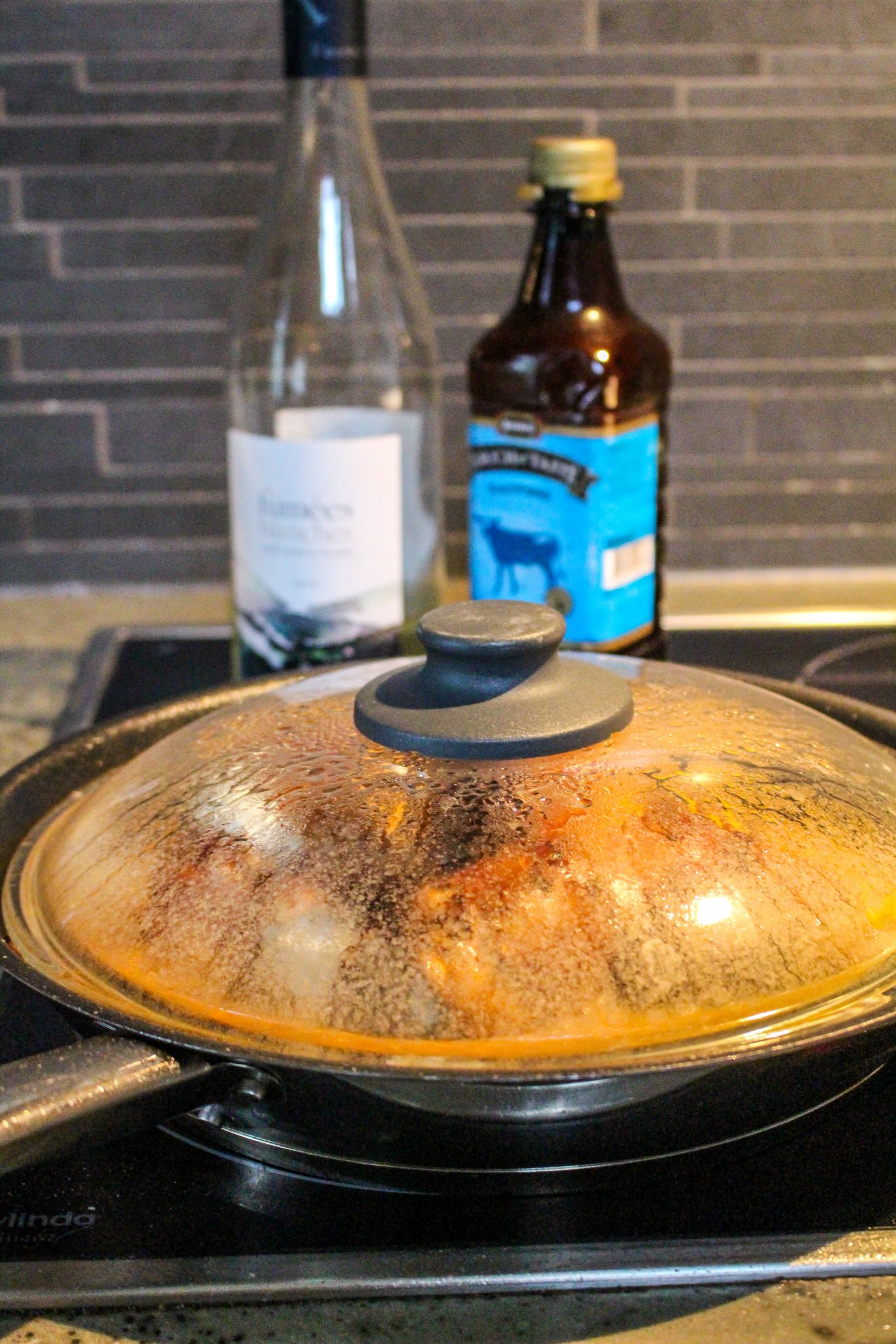 4) Häll i vin, vatten och kalvfond. Låt bräsera under lock på medelvärme i ca 5 minuter. (Ett av mina favoritvin är fumees blanches som är ett Sauvignon Blanc vin och smakar magiskt gott.)