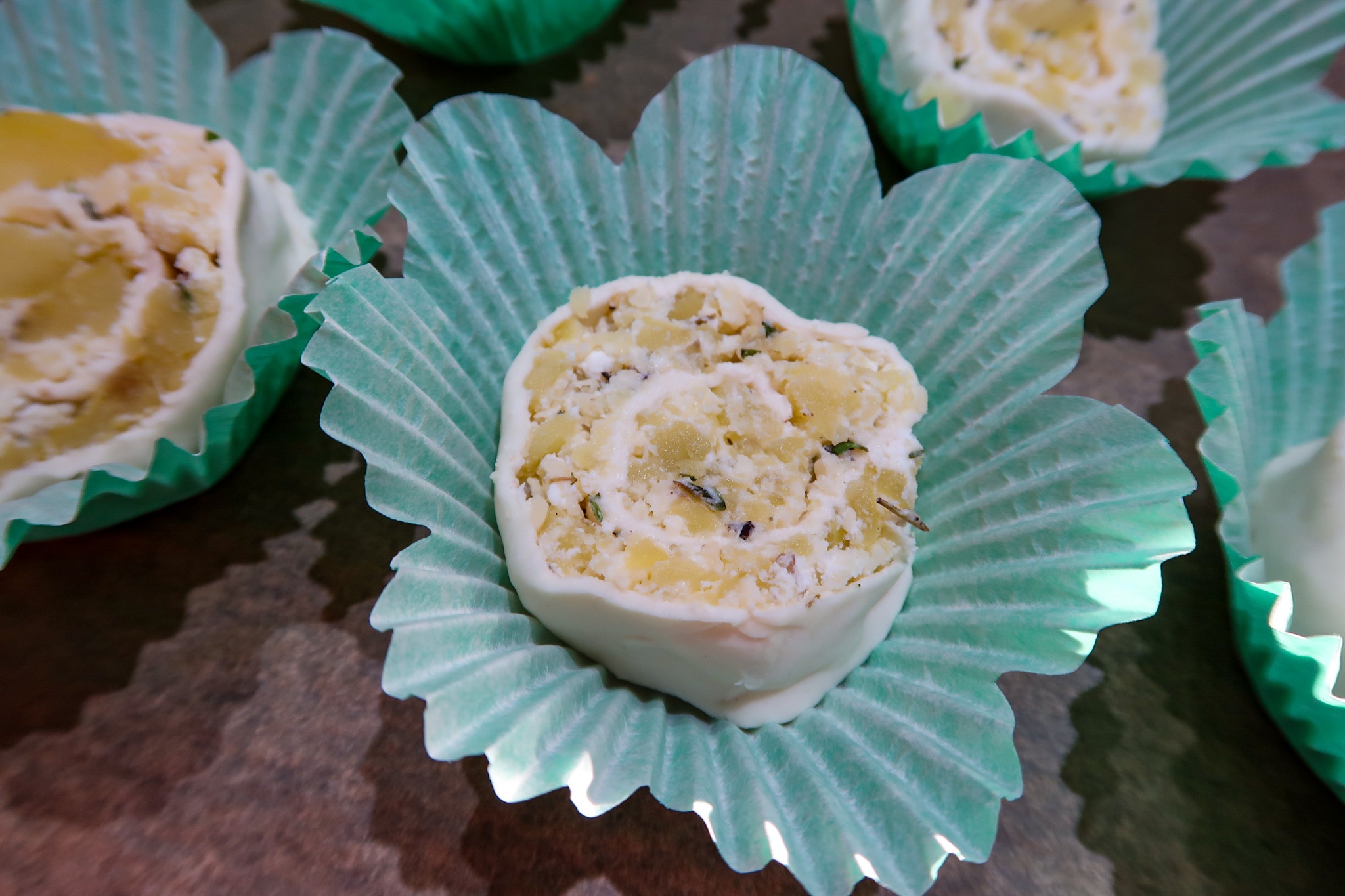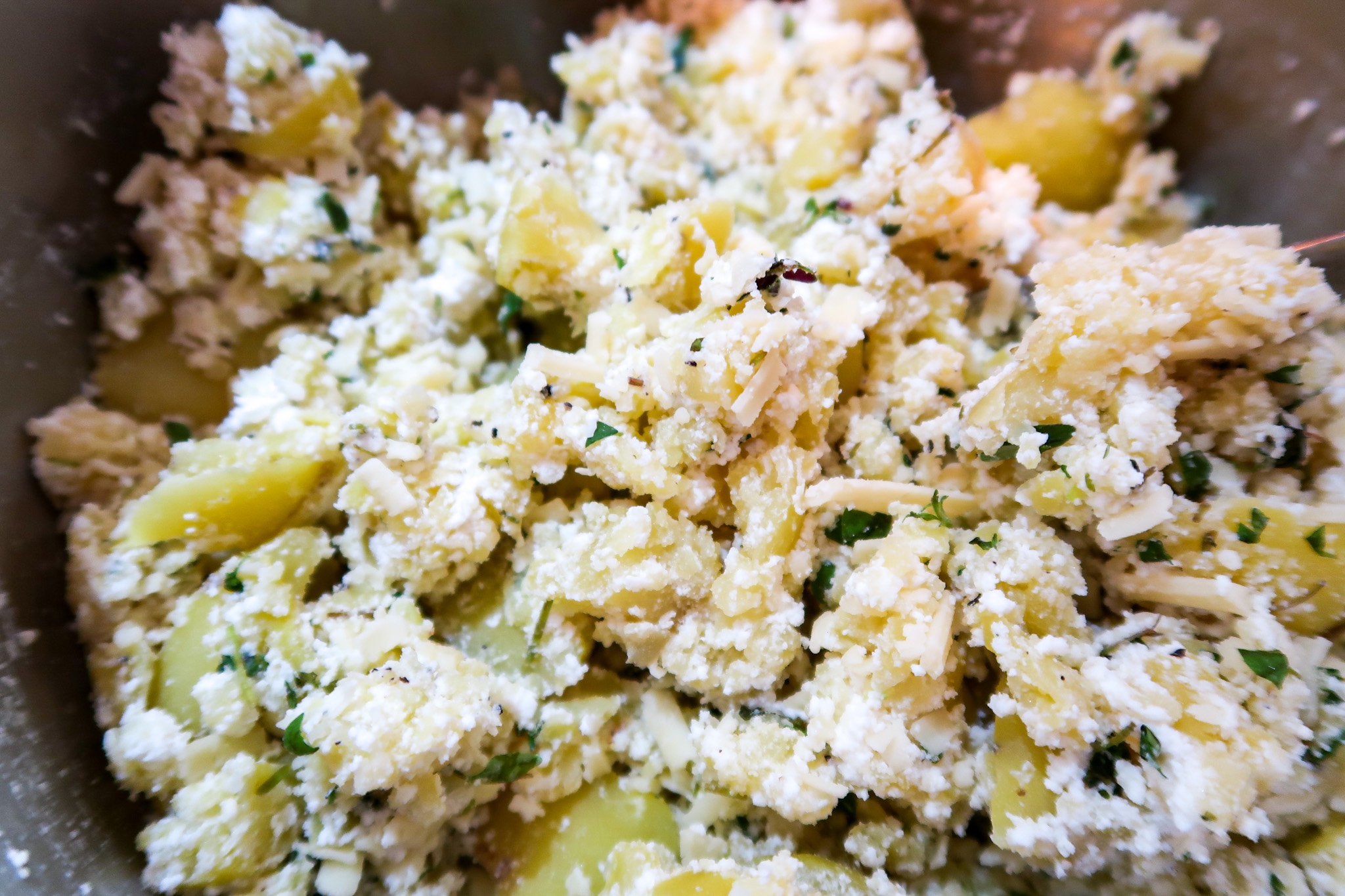 3) Potatisbakelserna: Krossa potatisarna i en bunke tills de blir lite mindre bitar. Ha i ricotta, riven ost, vitlök, timjan, salt & peppar. Blanda.