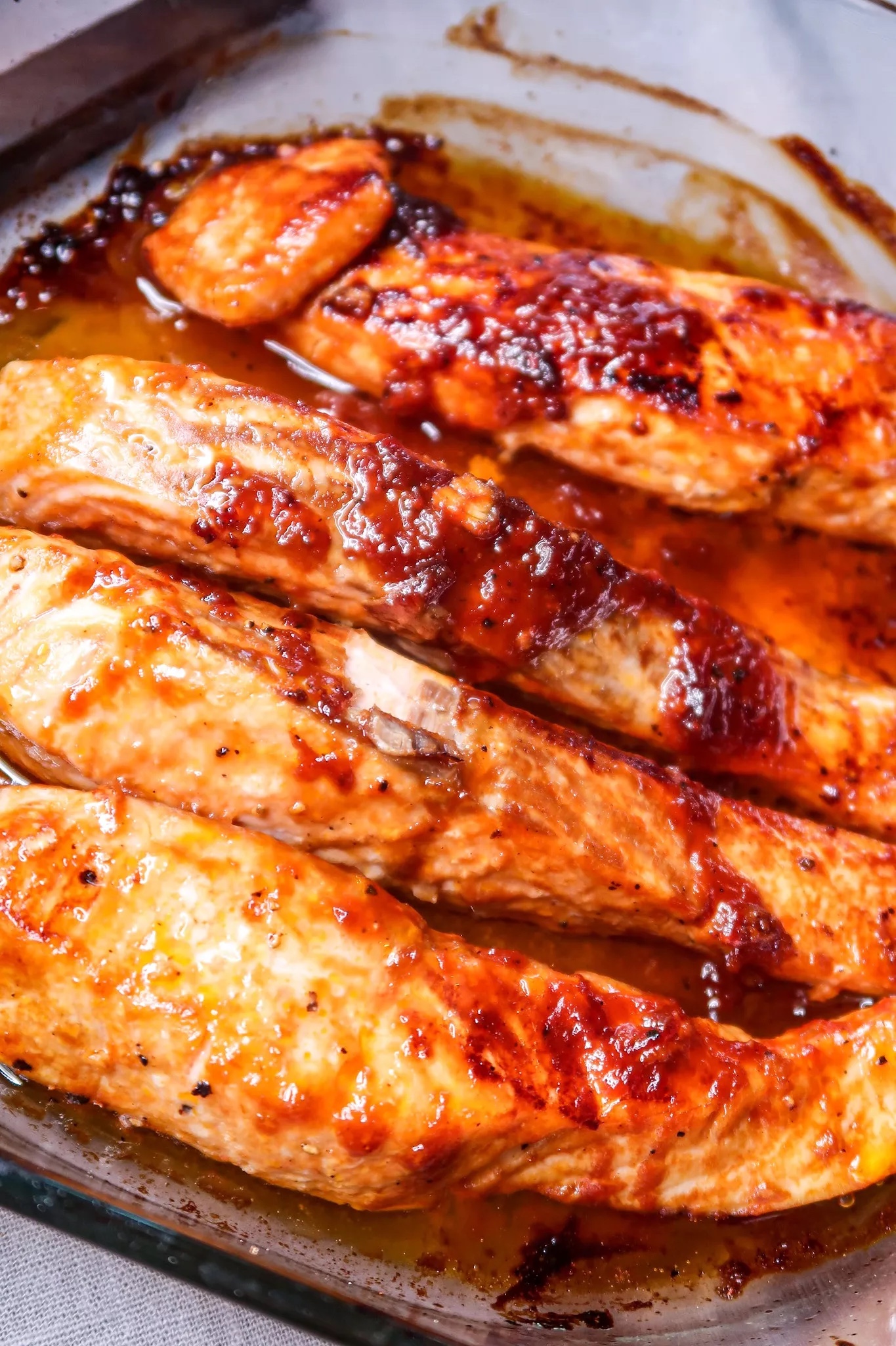 3) Ta fram en ugnsform, lägg i laxfiléerna i den och häll i marinaden över filéerna. In i ugnen på 200 grader i ca 15 min. Kolla så laxen är klar, dela den lite med en gaffel, går den isär med stora skivor är den klar.
