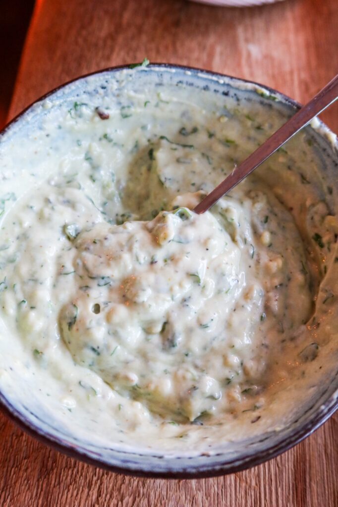 2) Pressa i vitlöken, hacka basilikan smått (du kan också köra den i matberedaren) och ha i den, pressa i citron, ha i honung, creme fraiche, chili flaket och salta & peppra efter smak.