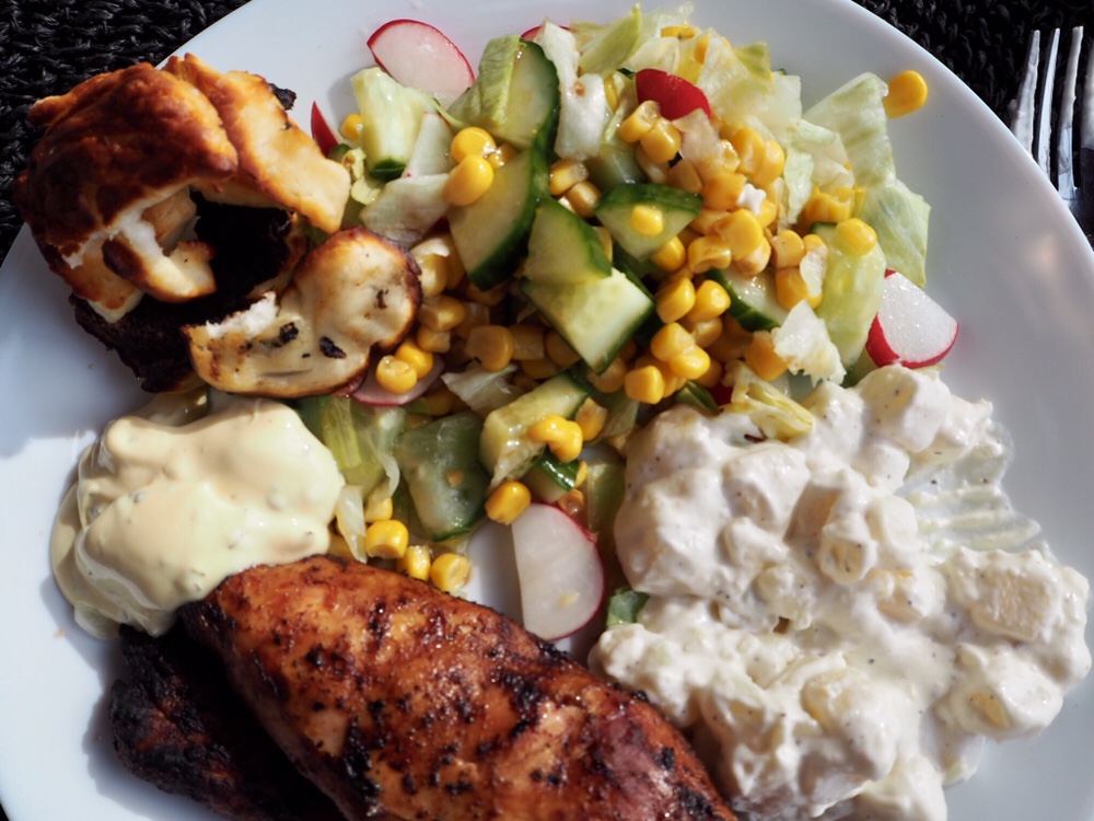 Exet kom förbi och slog på grillen. Lyxigt att sätta sig vid färdigt bord. Grillad kyckling med potatissallad, sallad, bea och grillade halloumi. Har sån dille på det nu. Så sjukt gott!