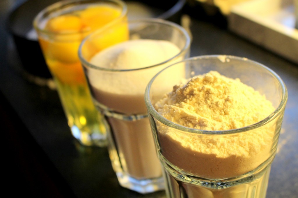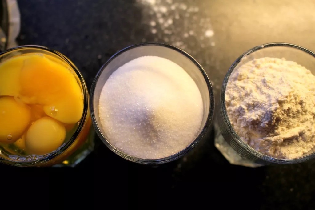 Knäck i alla äggen i ett stort glas. Därefter tar du fram 2 likadana glas, så du ska alltså ha 3 likadana glas. I det ena häller du upp strösocker och i det tredje hälften mjöl och hälften potatismjöl. Önskar du glutenfritt tar du potatismjöl i hela glaset. Du häller alltså upp det till samma nivå som äggen är.