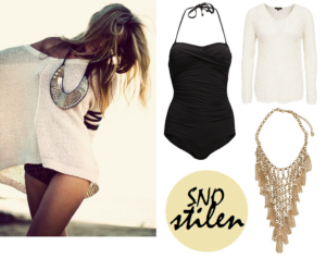 Ok, jag erkänner. Kanske att jag inte skulle åka till Fjärdhundrabadet (utomhusbad strax utanför Enköping) med ungar, badleksaker och kylväska såhär. Det kan jag ju erkänna. Då känns det mer en långklänning och foppatofflor liksom. 🙂 Men, om jag och Tony åkte själva till någon härlig söderhavsö, eller bara till Mallis, ja då skulle jag lätt vilja gå såhär och se lite skön ut. Tänk dig att det är skymining, å så sitter man i en varsin solstol och bara njuter av någon god drink och ser solen gå ner. Å så är man klädd såhär, med en härlig stickad tröja i bomull och en ”badis” bara och ett halsband som ser ut att vara påslängt bara. Underbart….
