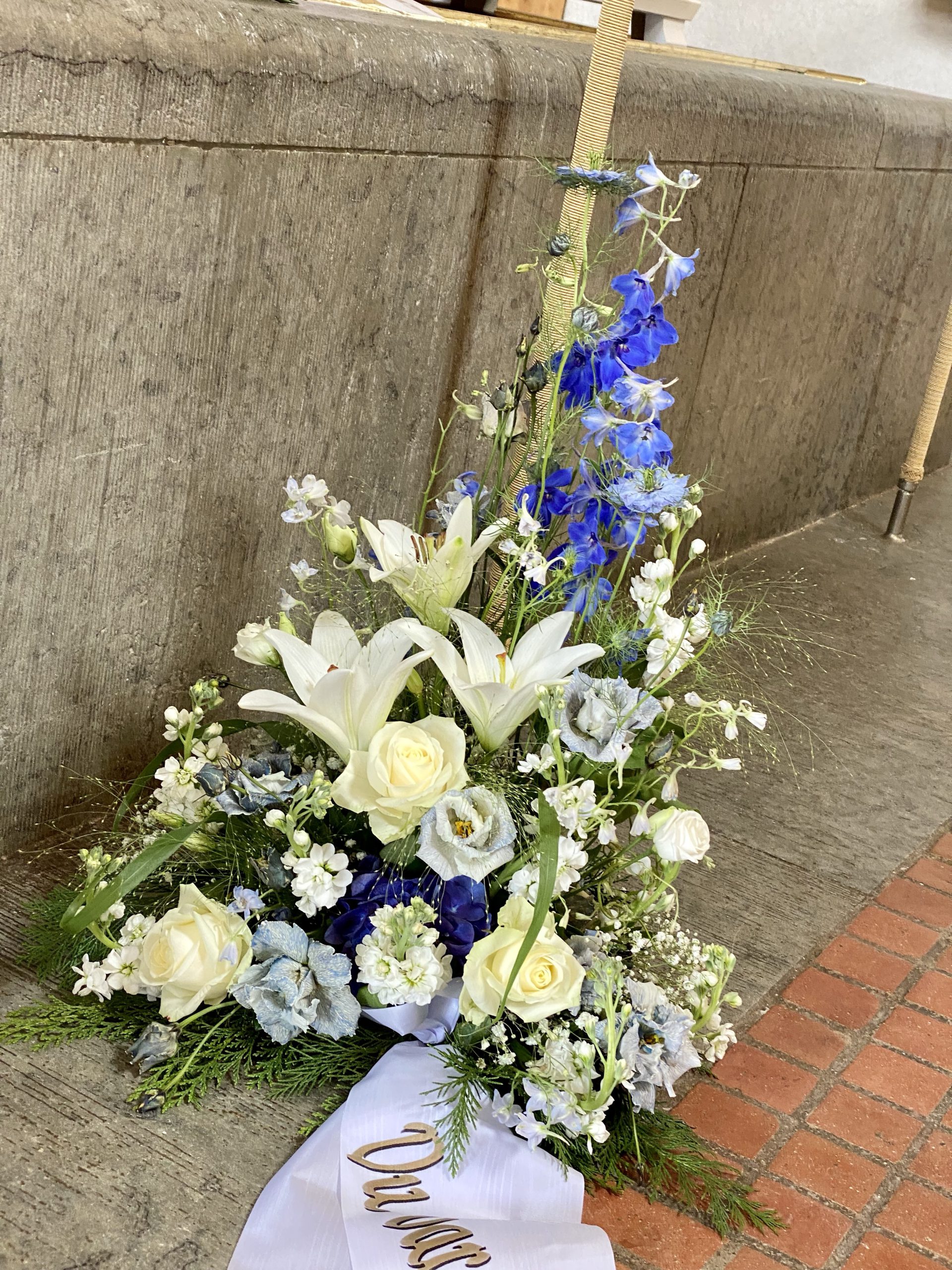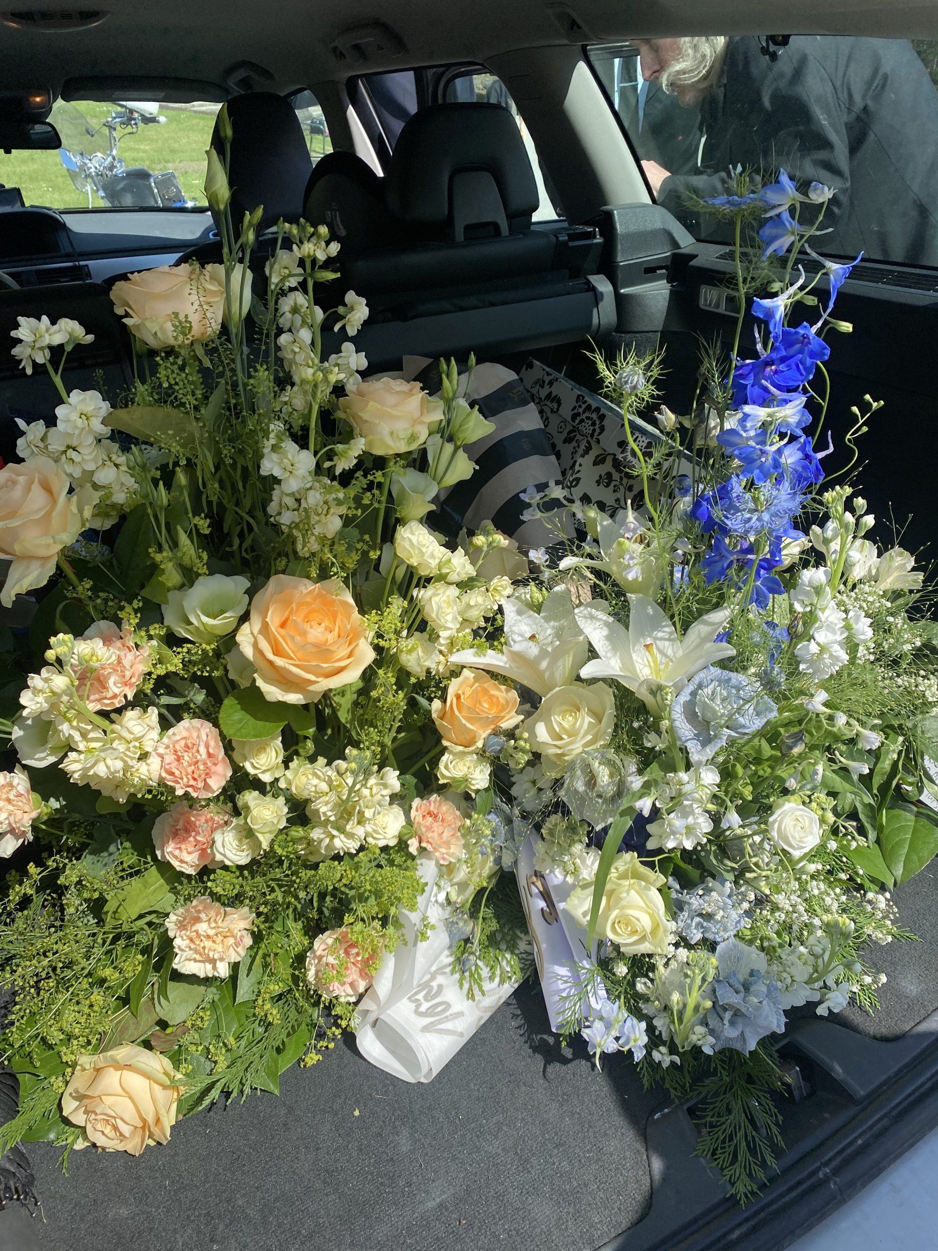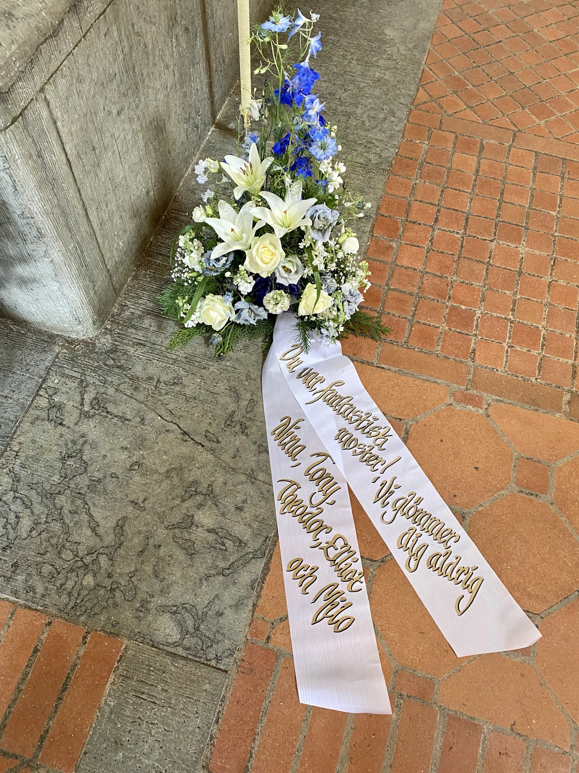 Vi valde att beställa på hemmaplan för att ta med dem själva. I vanliga fall beställer man ju i den staden begravningen ska vara på. Och i vanliga fall så kör Asplunds blommorna till kyrkan ja.