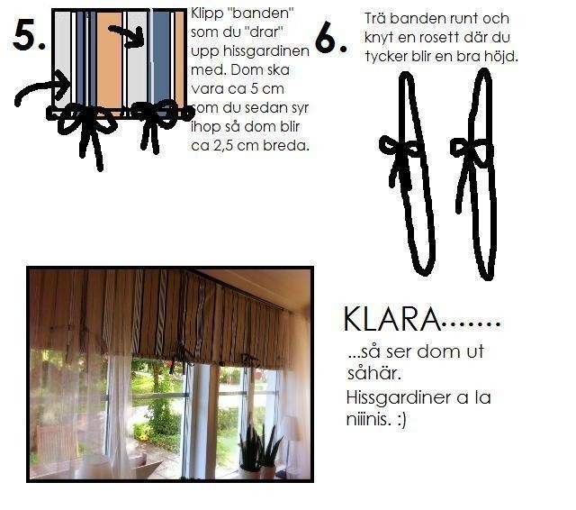 Ja, ungefär såhär gör jag när jag syr mina hissgardiner. Man behöver som sagt inte ha denna träpinne högst upp utan kan bara klippa lite försiktigt i tyget, sy runt så att det bli hållbart, trä igenom skruv och sedan skruva fast i väggen eller i fönsterlisten. Man kan oxå banka i ringar högst upp som du sedan skruvar upp hissgardinen i. Det gör man som man vill och orkar. Längst ner trär du igenom en träpinne som ger lite tyngd och som du rullar upp tyget på när du drar upp hissgardinen.
