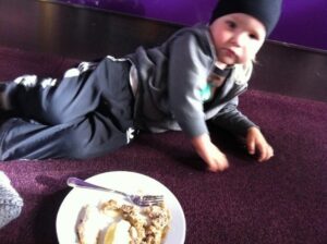 Milo ligger och äter på eventet. Köttbullarna var supergoda!!!