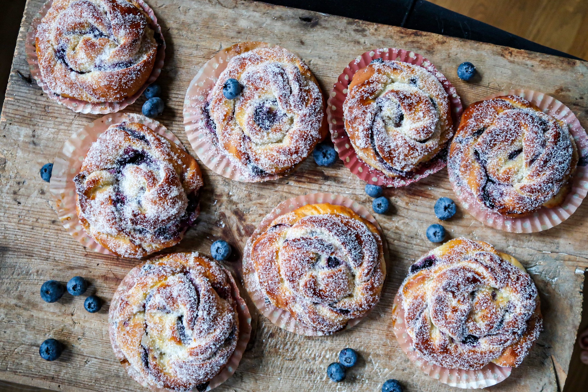Att rulla bullar i strösocker istället för pärlsocker kan ju vara så himla gott. Då blir hela bullen täckt av socker och ger smak åt överallt. Så gott! De syrliga blåbären med mandelmassa och strösocker, ja då har du en himmelsk bulle att njuta av.