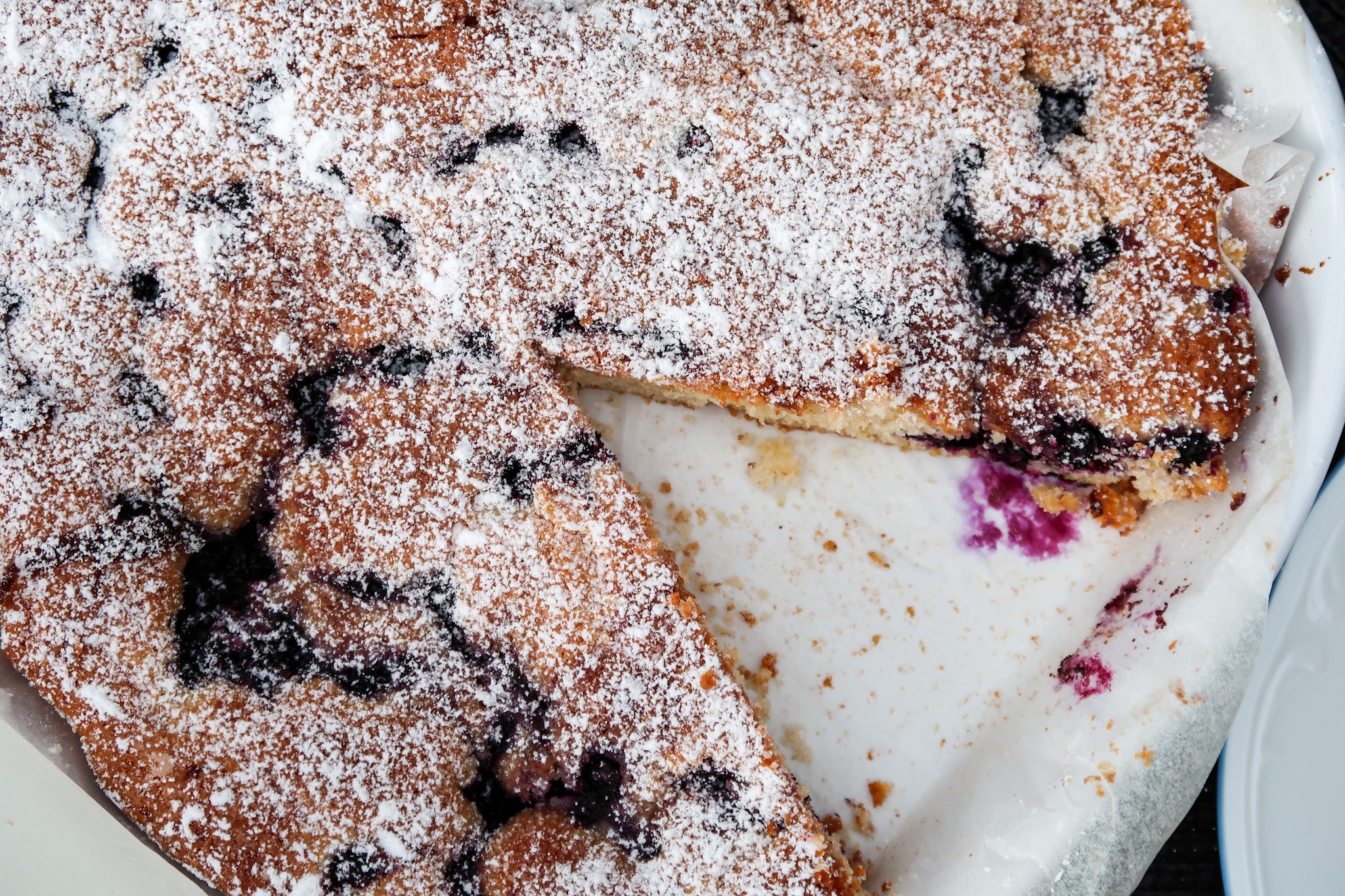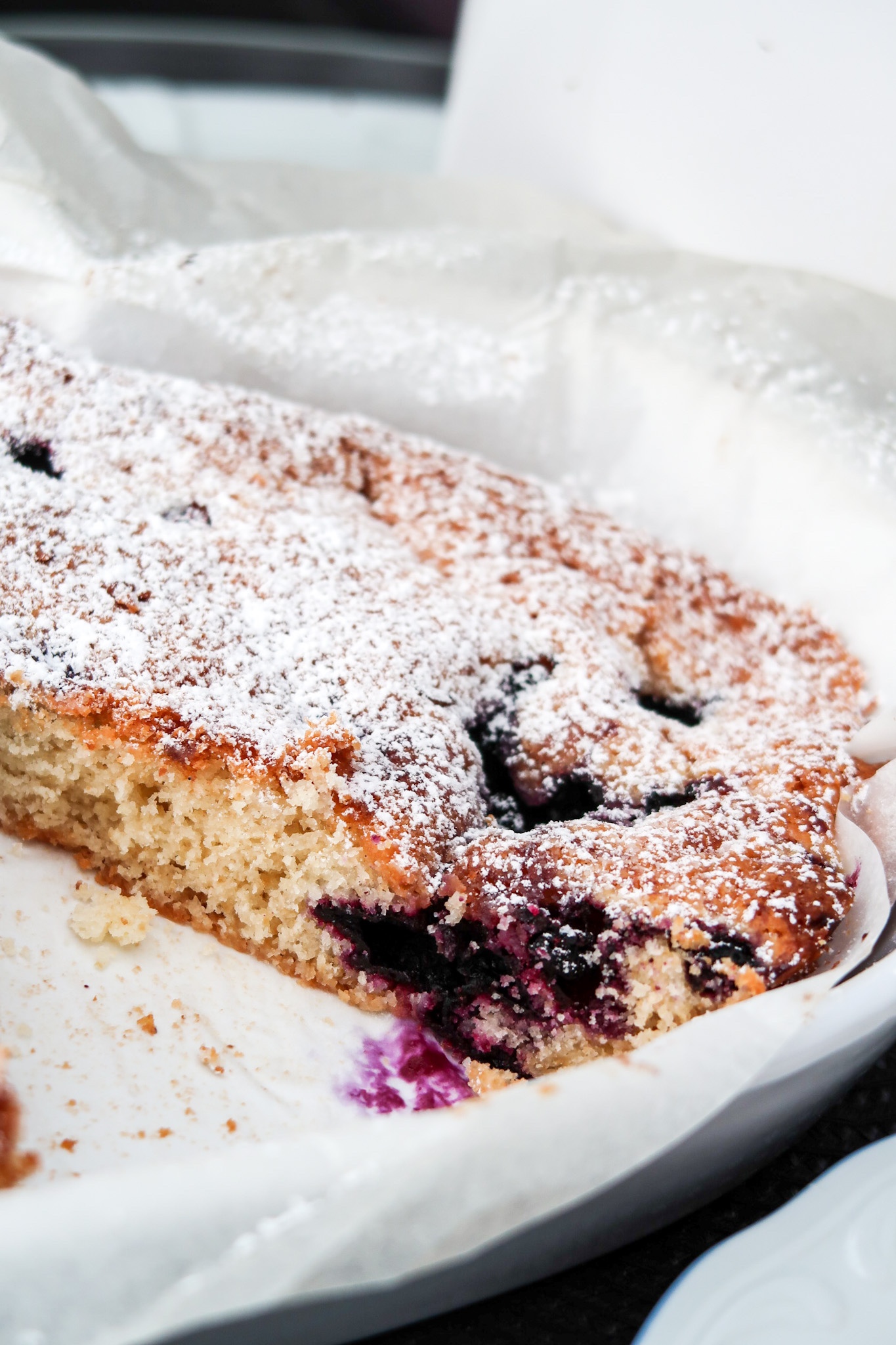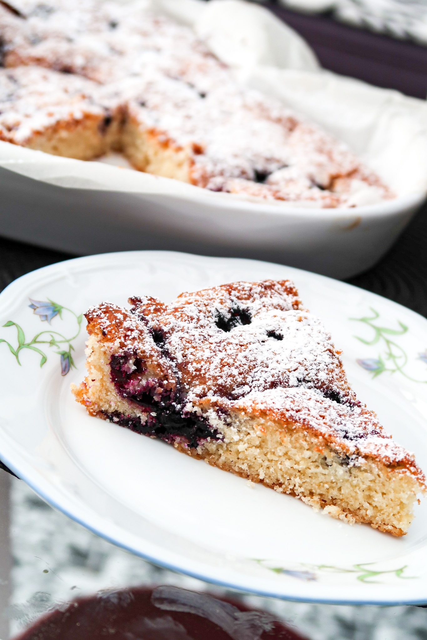 3) Fördela jämnt i formen, strö över blåbären. Skjuts in i ugnen i ca 15 minuter. Känn med sticka, den får gärna vara lite lite kladdig. Pudra med florsocker.