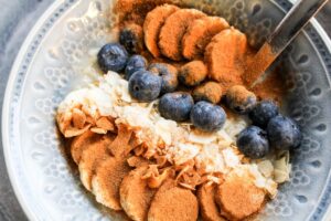 Nu blir det frukostfix framför morgon TV till att börja med. Häromdagen gjorde jag denna härliga tallrik till frukost. Havregrynsgröt i botten, sedan är det skivade bananer, kokosflakes, färska blåbär och kanel uppepå. Sååå mycket roligare och såå mycket godare. Tips till dig som tycker havregrynsgröt verkar vara så tråkigt att äta till frulle.