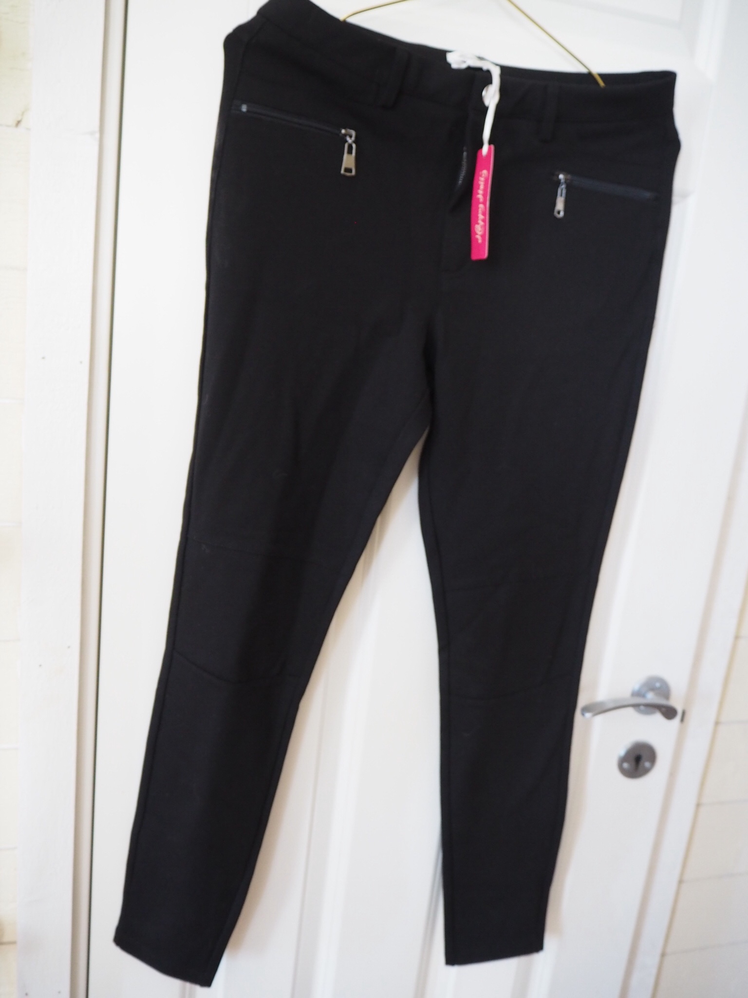 Svarta byxor från Happy Holly. Bakfickor och dragkedjor på fickorna i fram. Aldrig använda så prislappen hänger kvar.