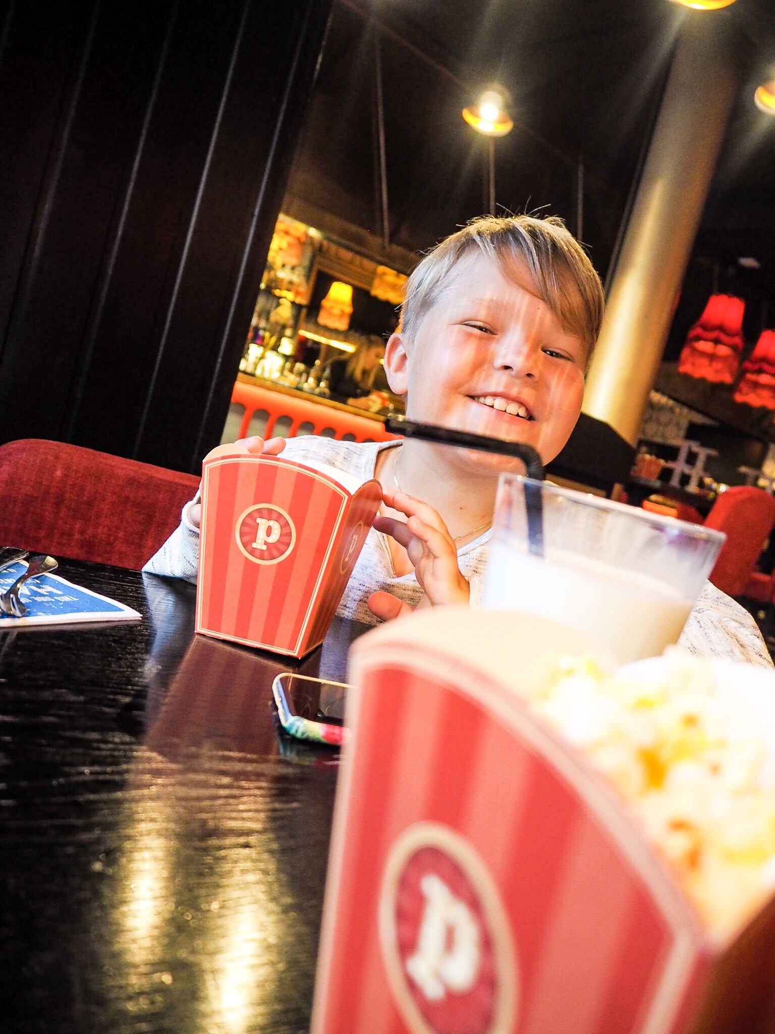 Vi älskar också att man får popcorn när man kommer. Milo slukar en bägare på nolltid. Han är verkligen galen i popcorn.