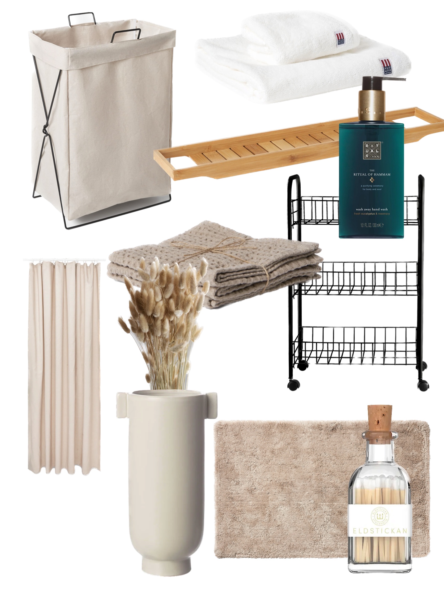 Tvättkorg HÄR // Handdukar HÄR (REA) // Duschdraperi HÄR // Badkarshylla HÄR // Rullvagn HÄR // Makeup handdukar HÄR // Badrumsmatta HÄR // Vas HÄR // Torkade växter HÄR // Rituals handtvål HÄR // Elstickan HÄR