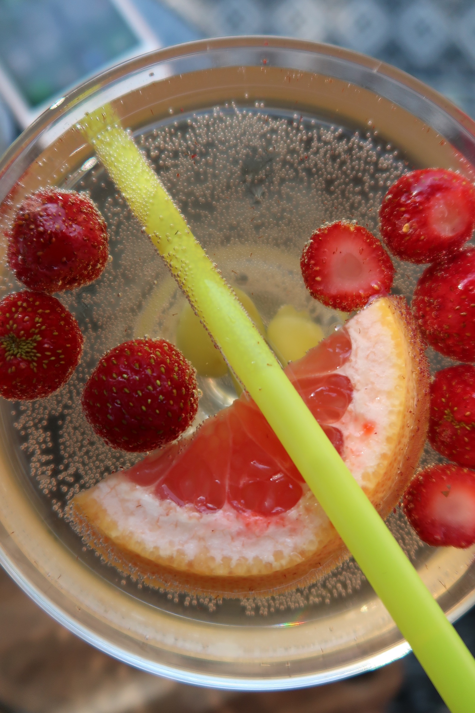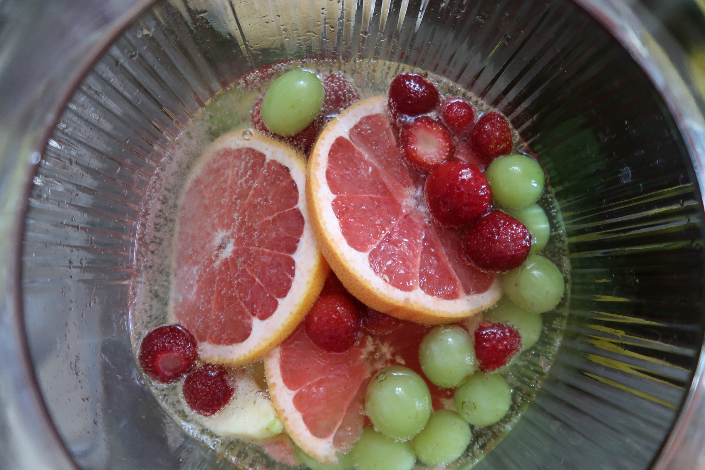 1) Frys vindruvorna och jordgubbar (styckfrys). Dessa fungerar som naturligt is i sangrian sedan.