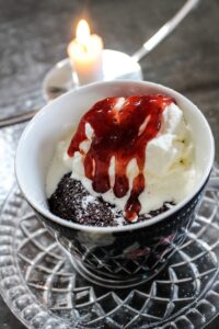 4) Kör på full effekt i micron. Börja med 45 sekunder, ha i den längre tid om den är för rinnig. Muggkakan ska vara lite rinnig längst in i mitten.